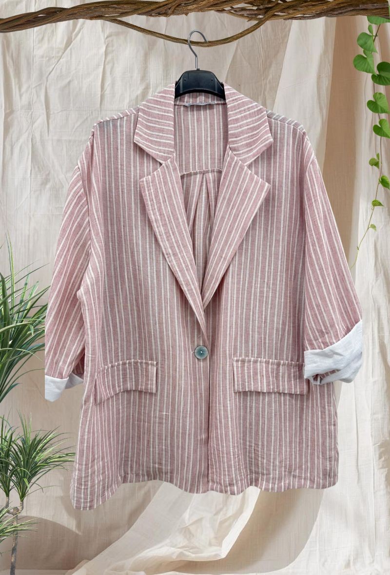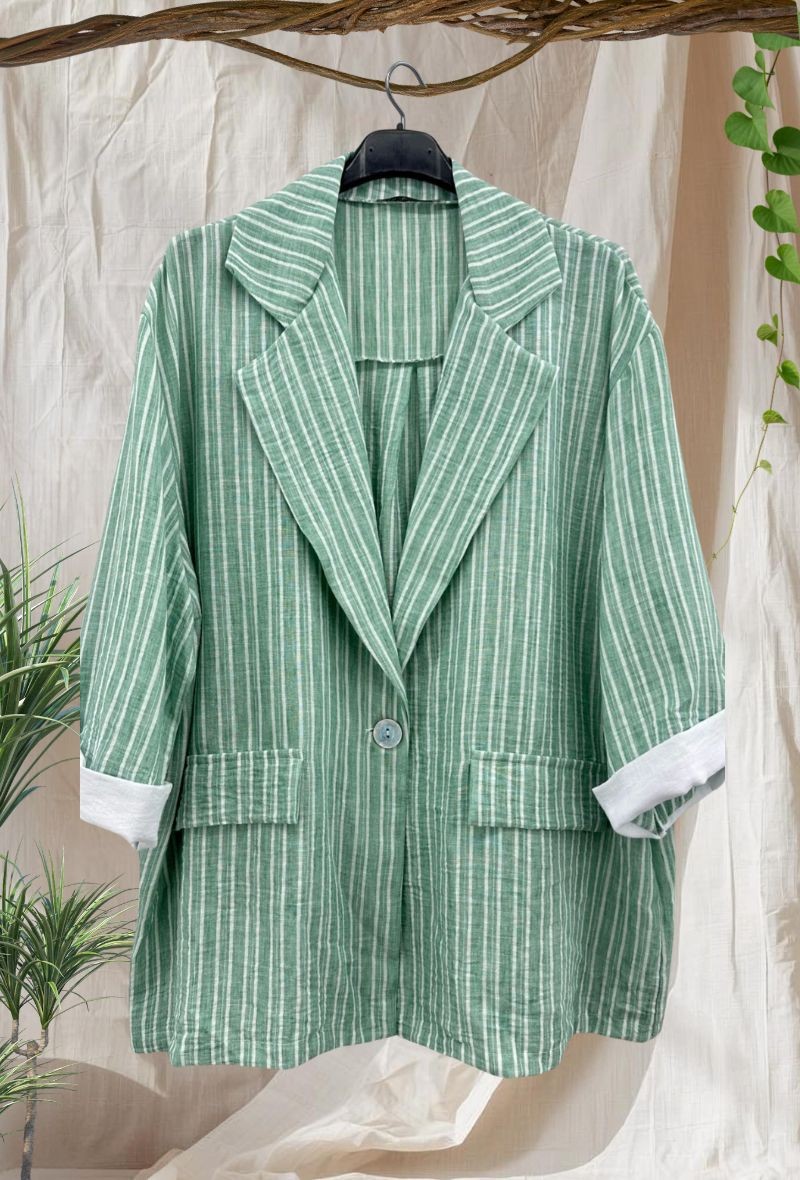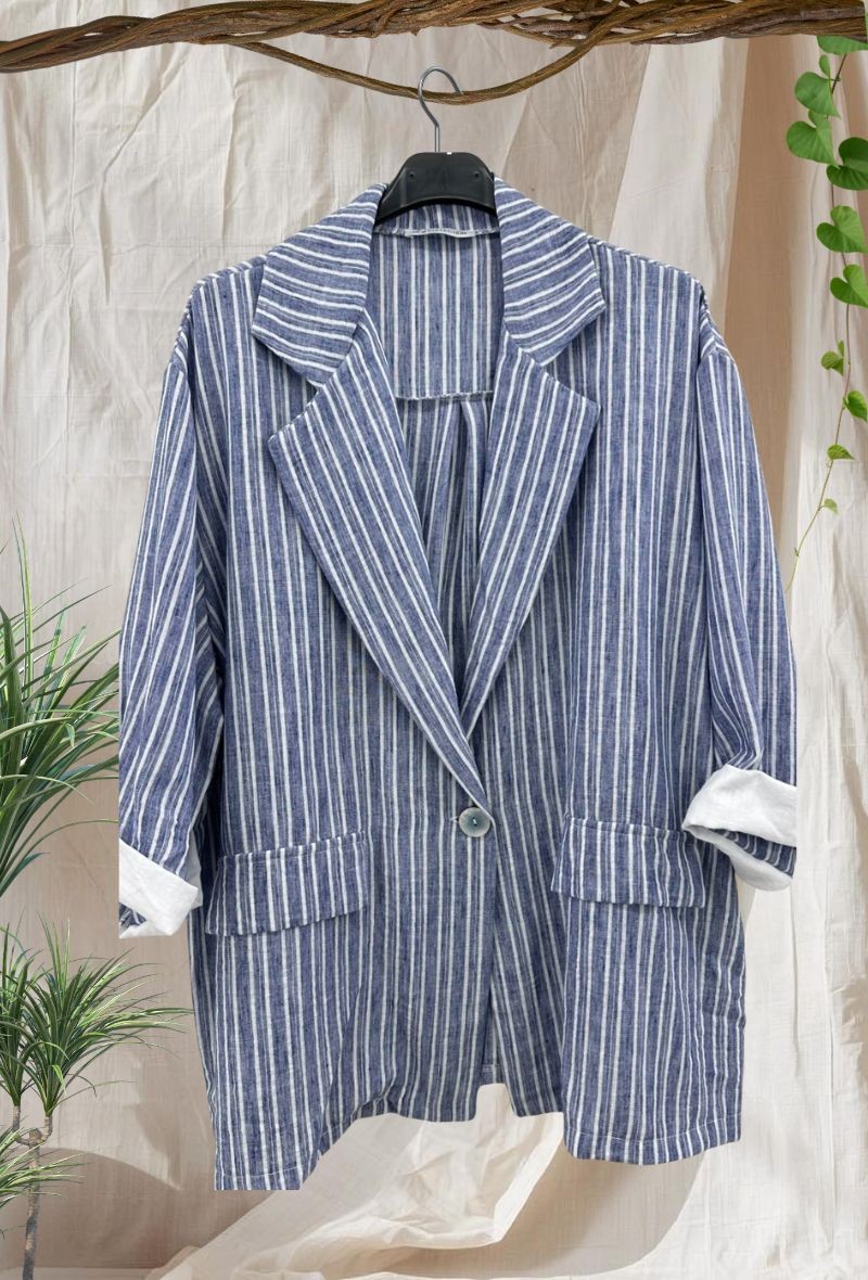 Chaqueta ligera de efecto lino con diseño de rayas que estiliza la figura. Corte cómodo y abierto, con solapa clásica y manga remangable para un look fresco y versátil. Ideal para completar cualquier outfit con un toque elegante sin renunciar a la comodidad.