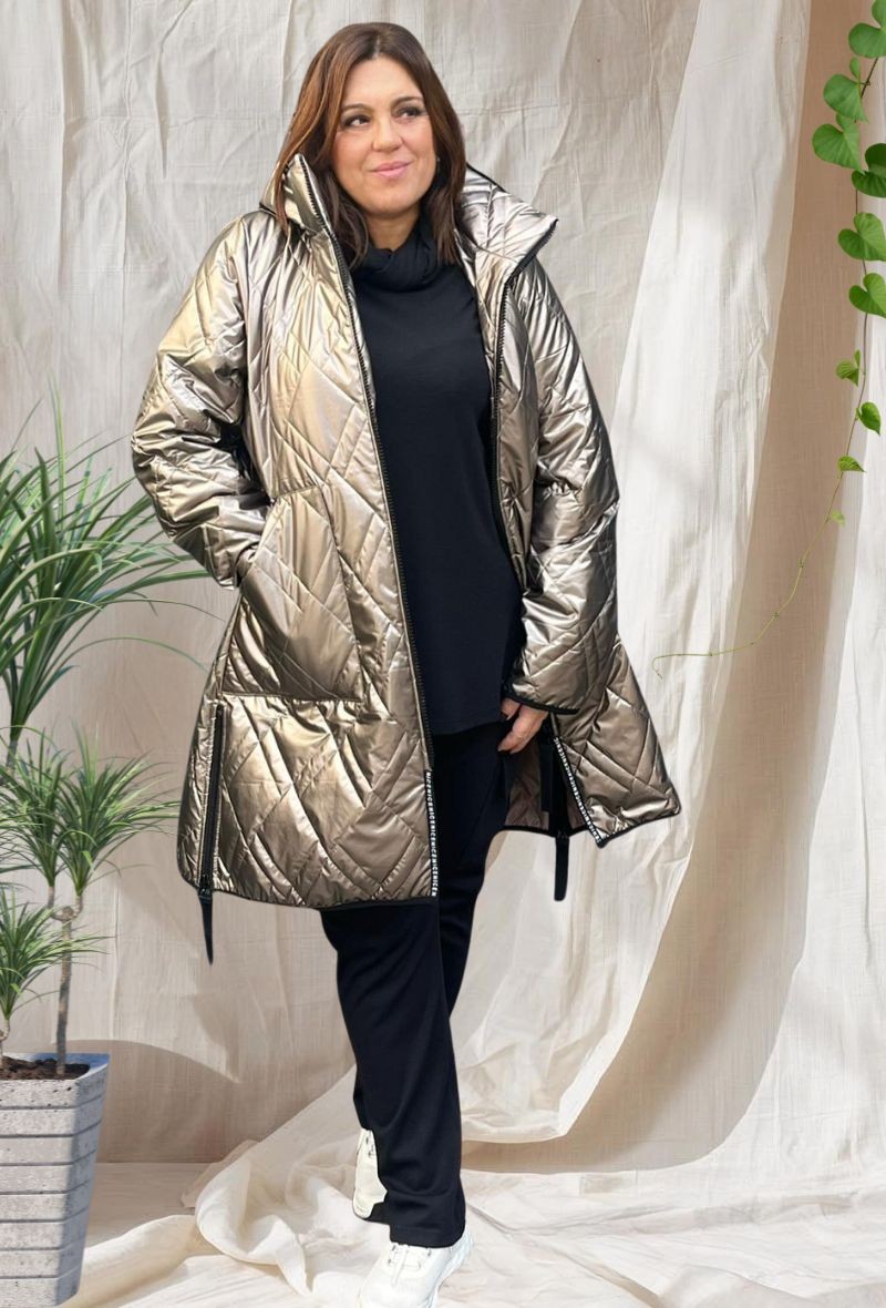 Parka acolchada ligera, no abultada, con capucha desmontable, cremalleras laterales y vivos en contraste. Su diseño moderno con acabado metalizado aporta un toque actual sin renunciar a la comodidad y al abrigo.
