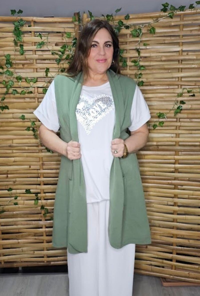 Chaleco largo de punto elástico y suave, sin mangas y con dos bolsillos laterales grandes. Ligero, cómodo y versátil, perfecto para combinar con camisetas o jerséis en looks casuales o más elegantes.