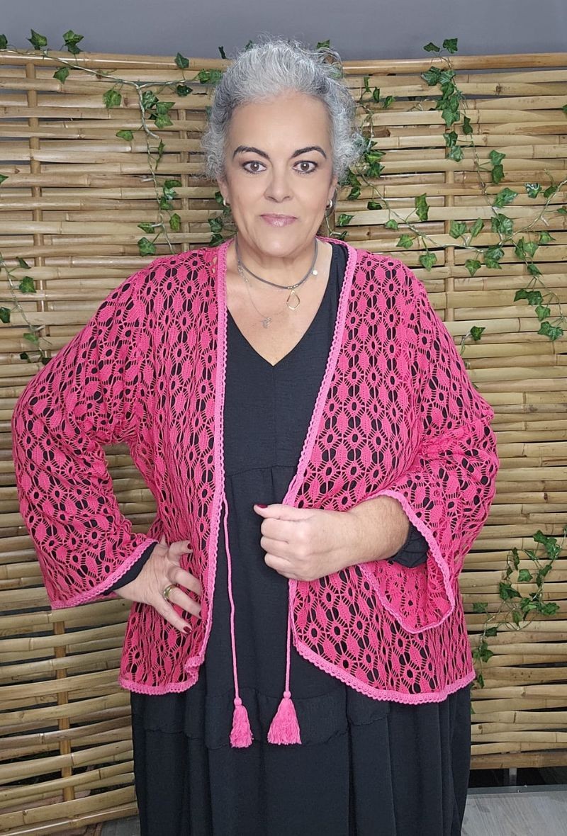 Chaqueta calada tipo kimono marca Indra, ligera y muy favorecedora. Diseño abierto con detalle de cordón decorativo, mangas amplias y acabado delicado que aporta un toque especial. Ideal para combinar sobre vestidos o camisetas básicas. Disponible en varios colores.