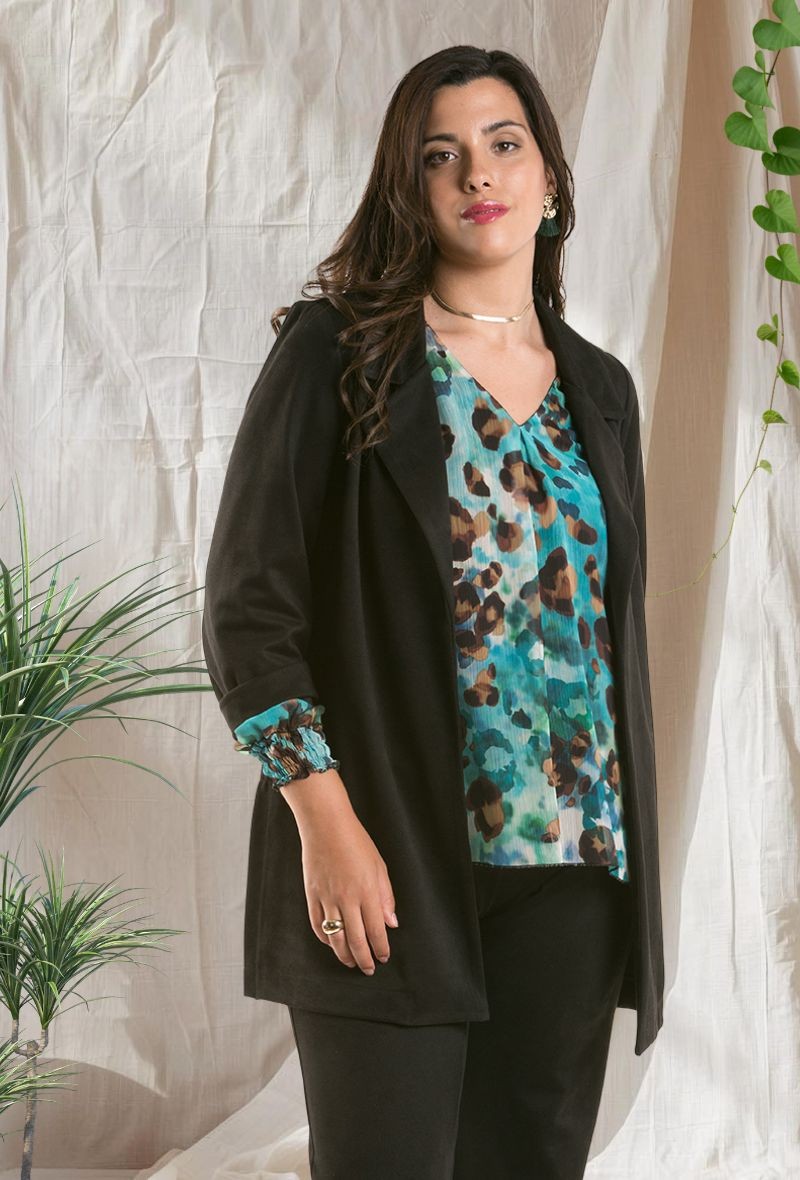 Blazer ligero de ante de sarga, con cuello de solapa y aberturas laterales que aportan estilo y comodidad. Ideal para completar looks casuales o dar un toque elegante.