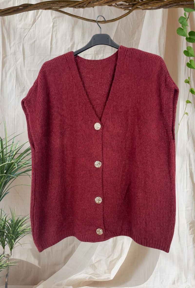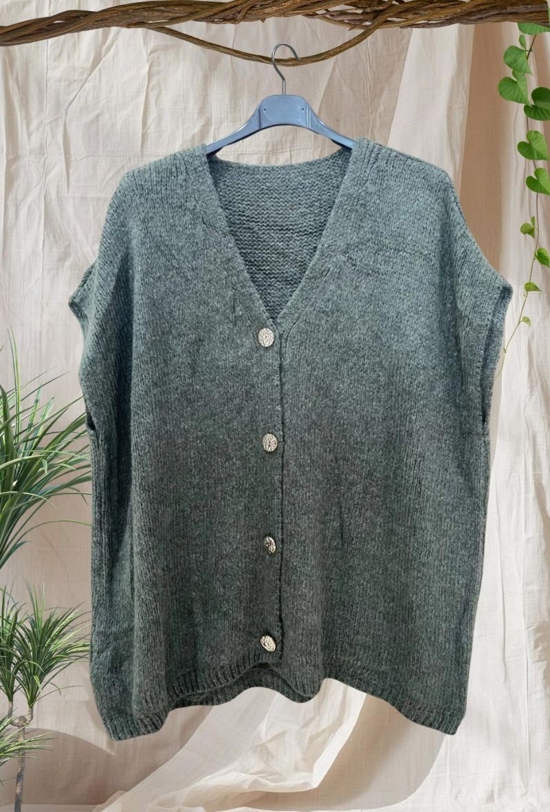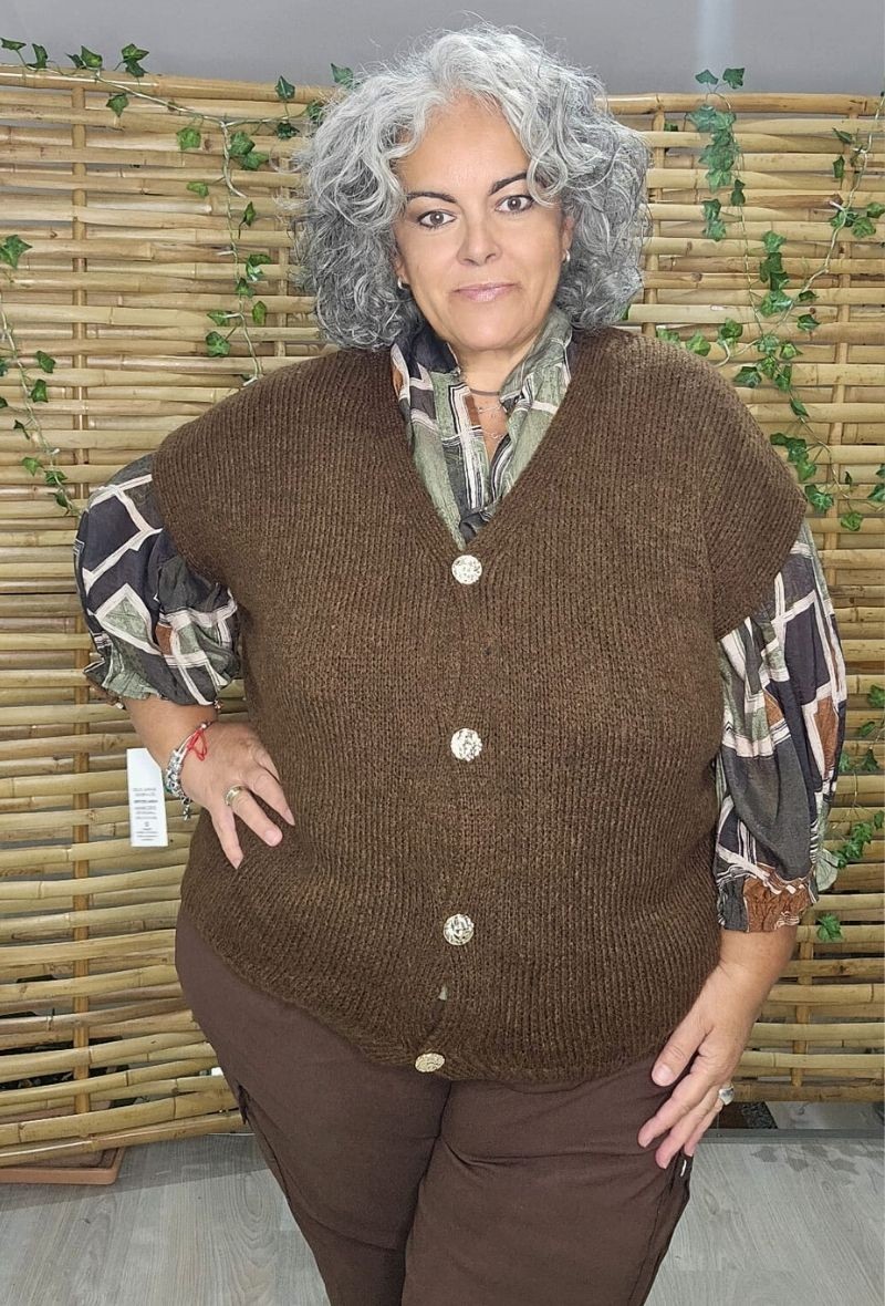 Chaleco de punto cálido y suave, sin mangas y cerrado con botones delanteros. Cómodo, versátil y perfecto para combinar con camisetas o blusas.