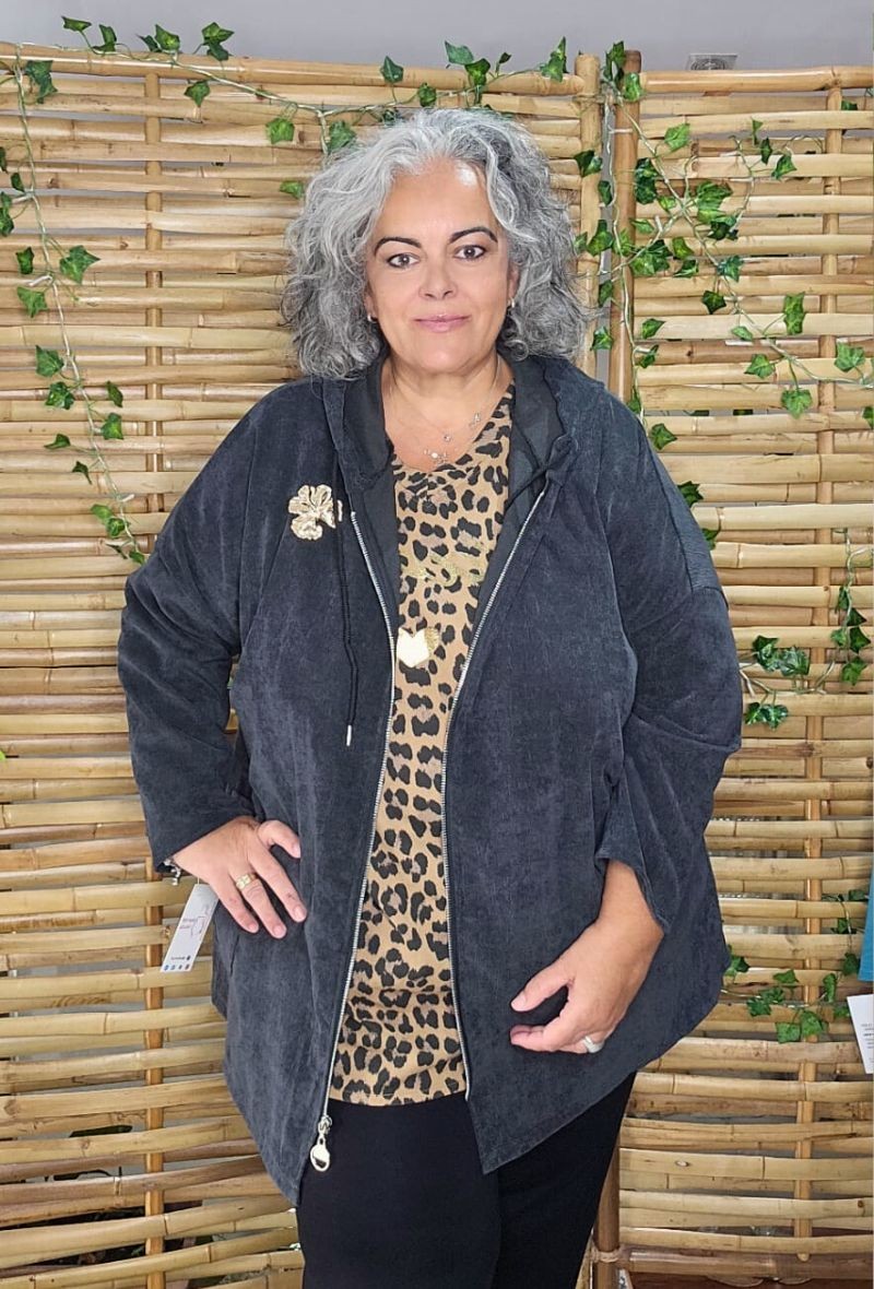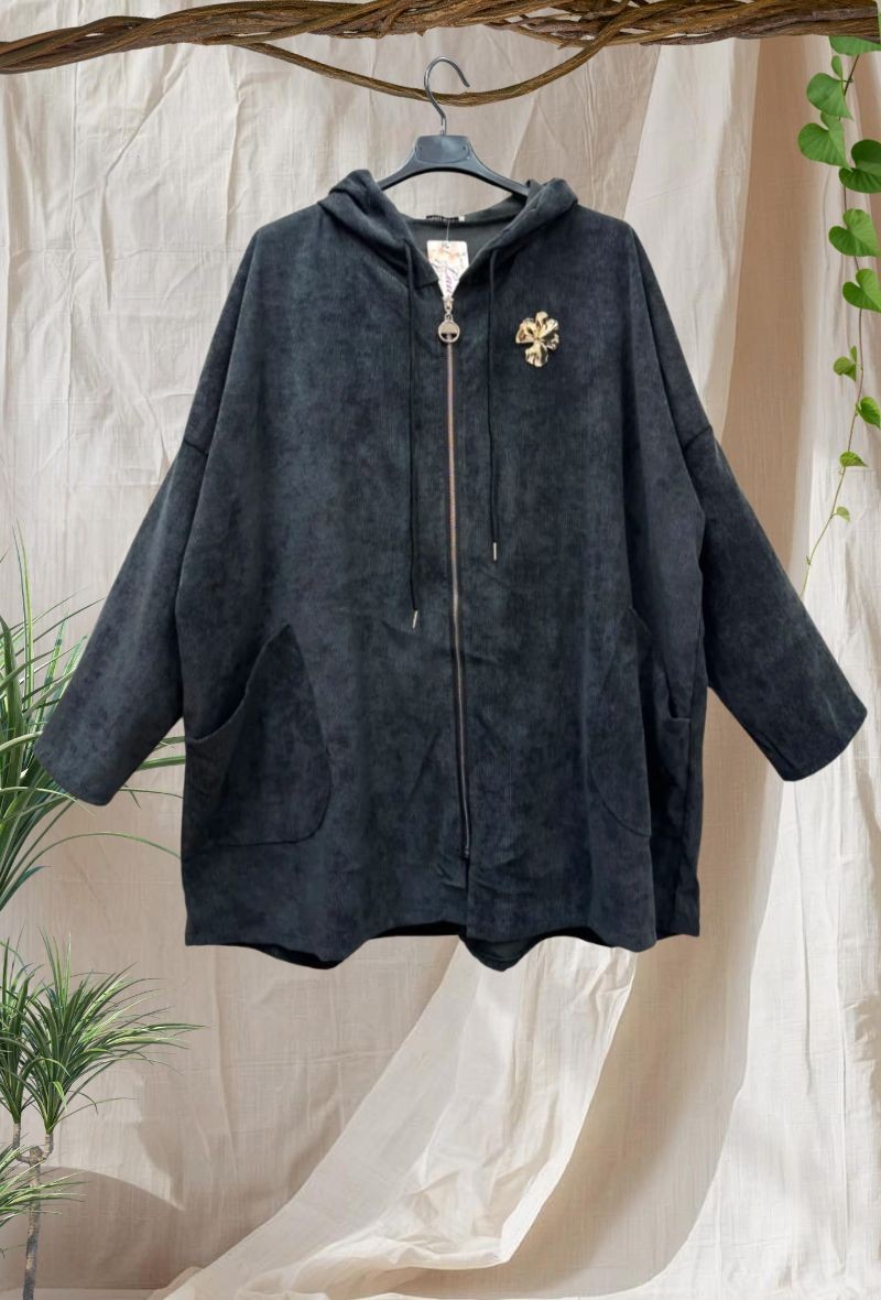 Cárdigan de pana milleraie, con capucha, cremallera delantera y dos bolsillos de parche. Incluye broche decorativo extraíble. Suave, cómodo y con un toque moderno.