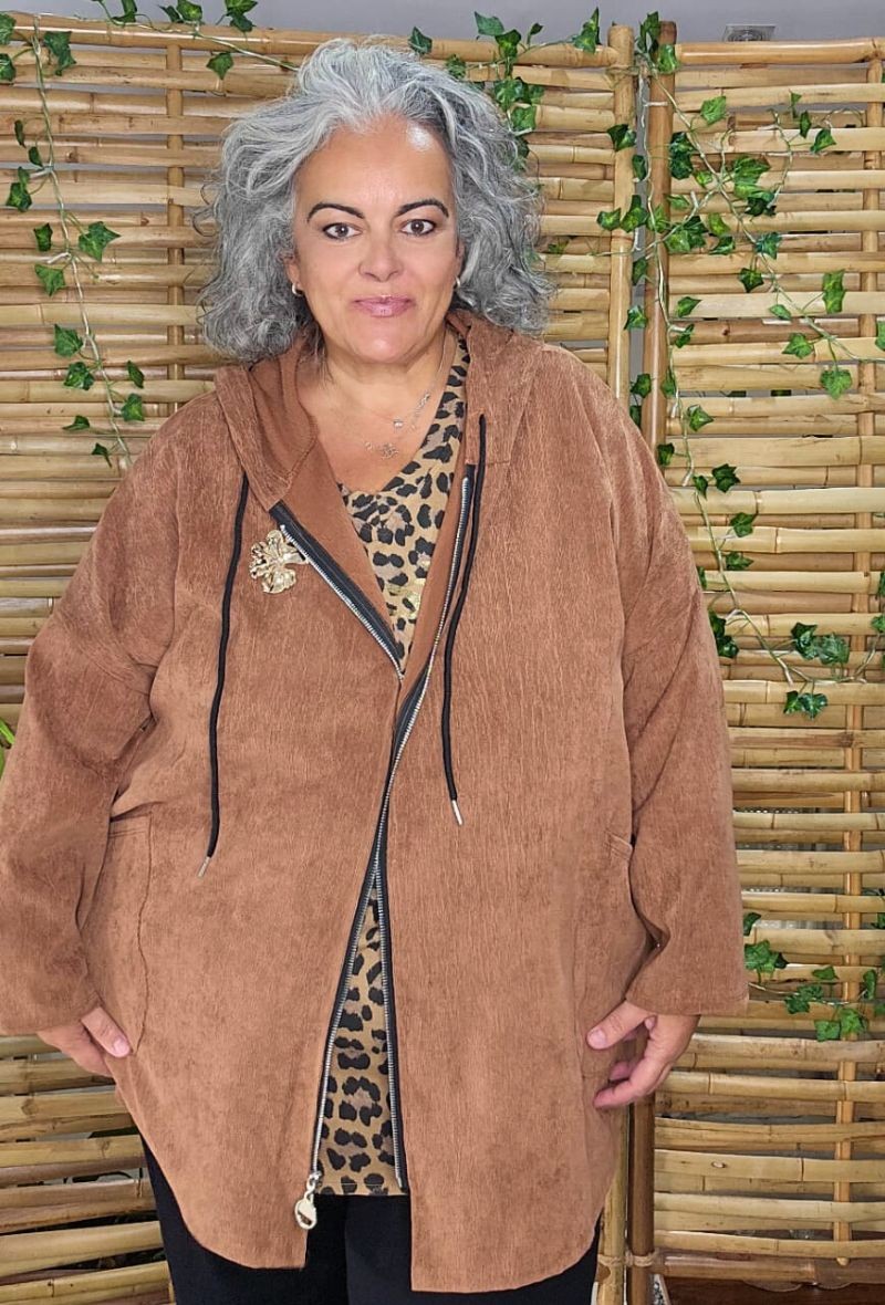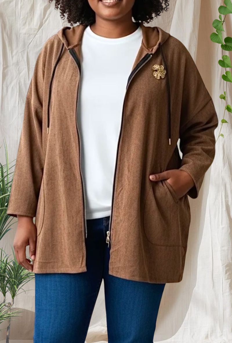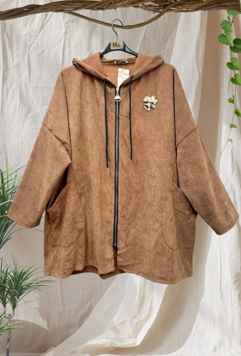 Cárdigan de pana milleraie, con capucha, cremallera delantera y dos bolsillos de parche. Incluye broche decorativo extraíble. Suave, cómodo y con un toque moderno.