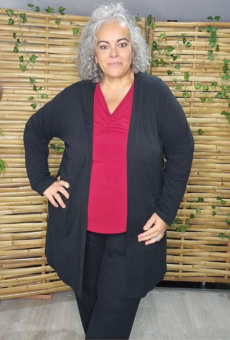 Guardapolvo de tejido de punto caliente, sin cierre, con bolsillos delanteros decorados en polipiel. Su diseño combina elegancia y comodidad, ideal para completar el conjunto con el pantalón Antenas, confeccionado en el mismo tejido.