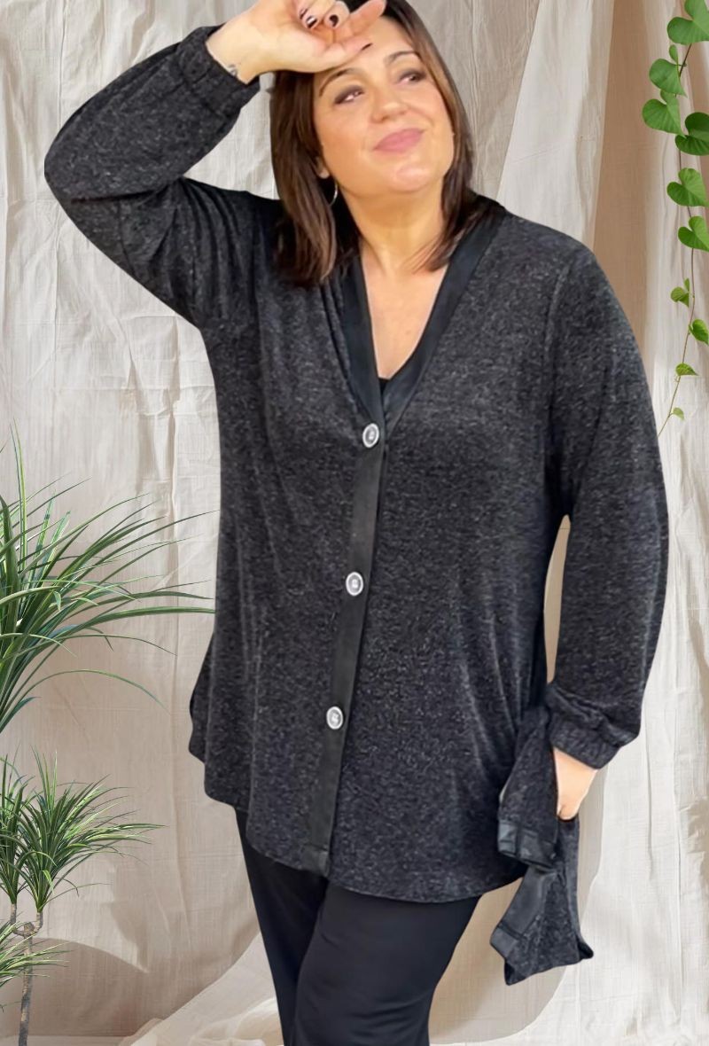 Casaca de punto rizo, estilo estilo camisero cierre con botones, con tapeta en polipiel. Disponible en colores crudo, camel y gris oscuro. Ligero, moderno y fácil de combinar.