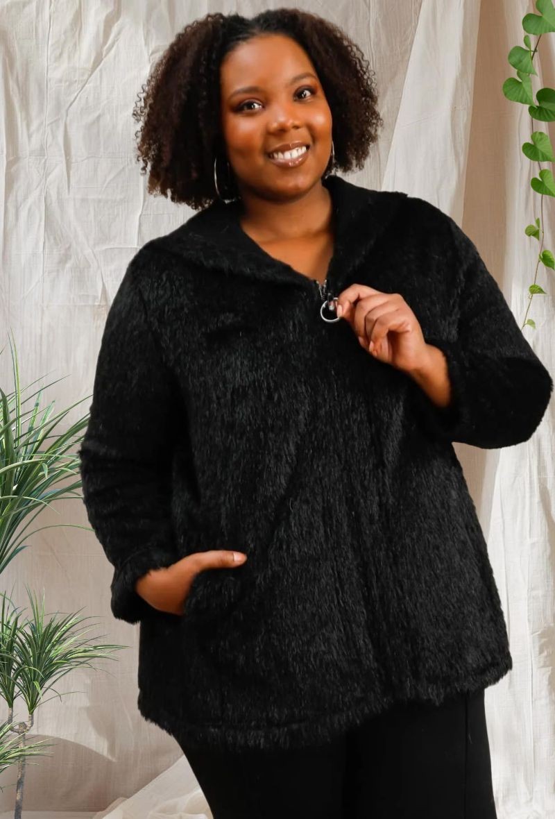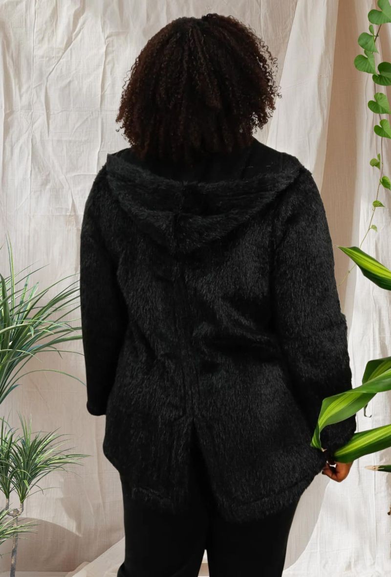 Abrigo con capucha forrada en piel sintética, cierre de cremallera y tejido cálido, ideal para los días fríos de otoño e invierno. Cómodo, moderno y muy favorecedor.