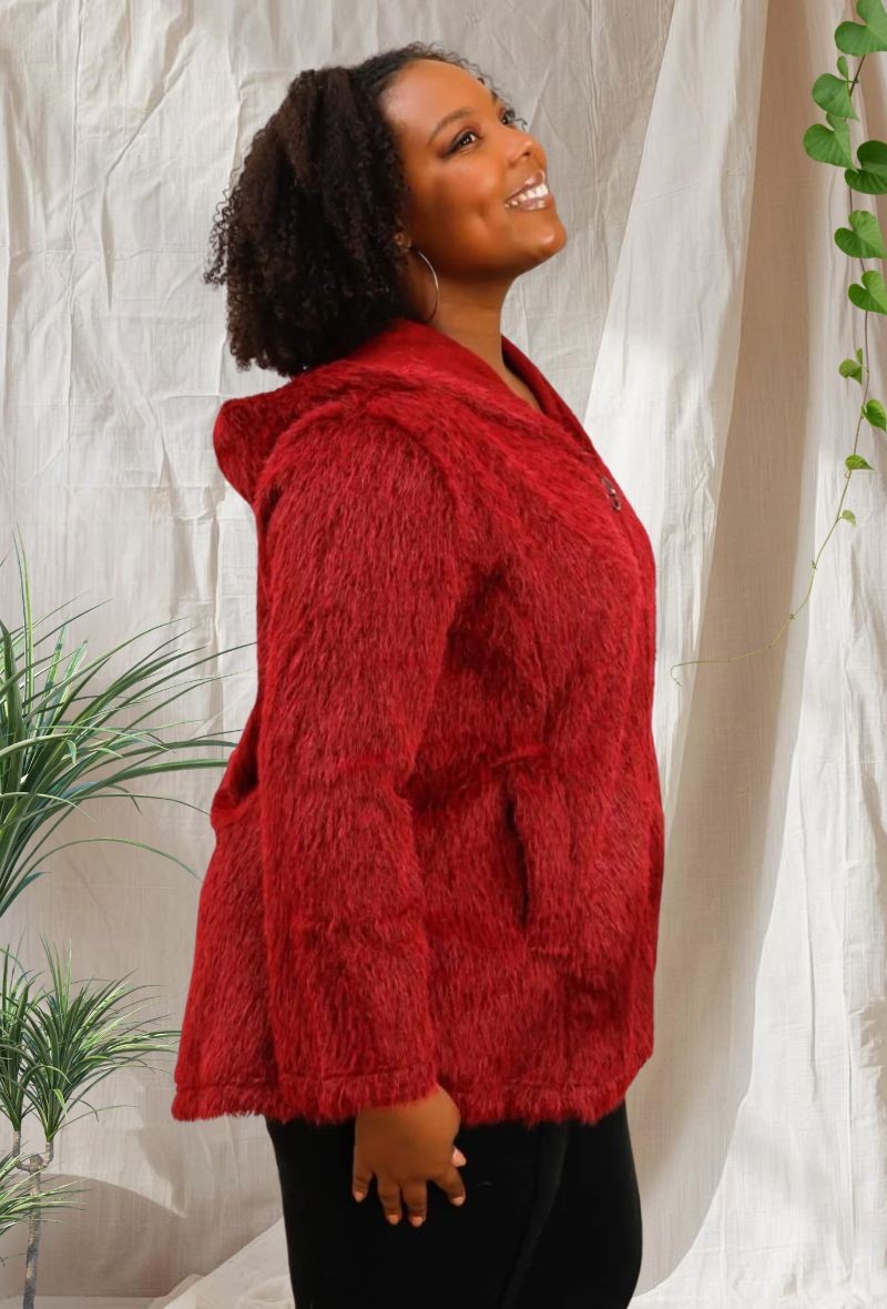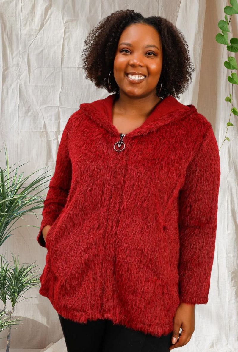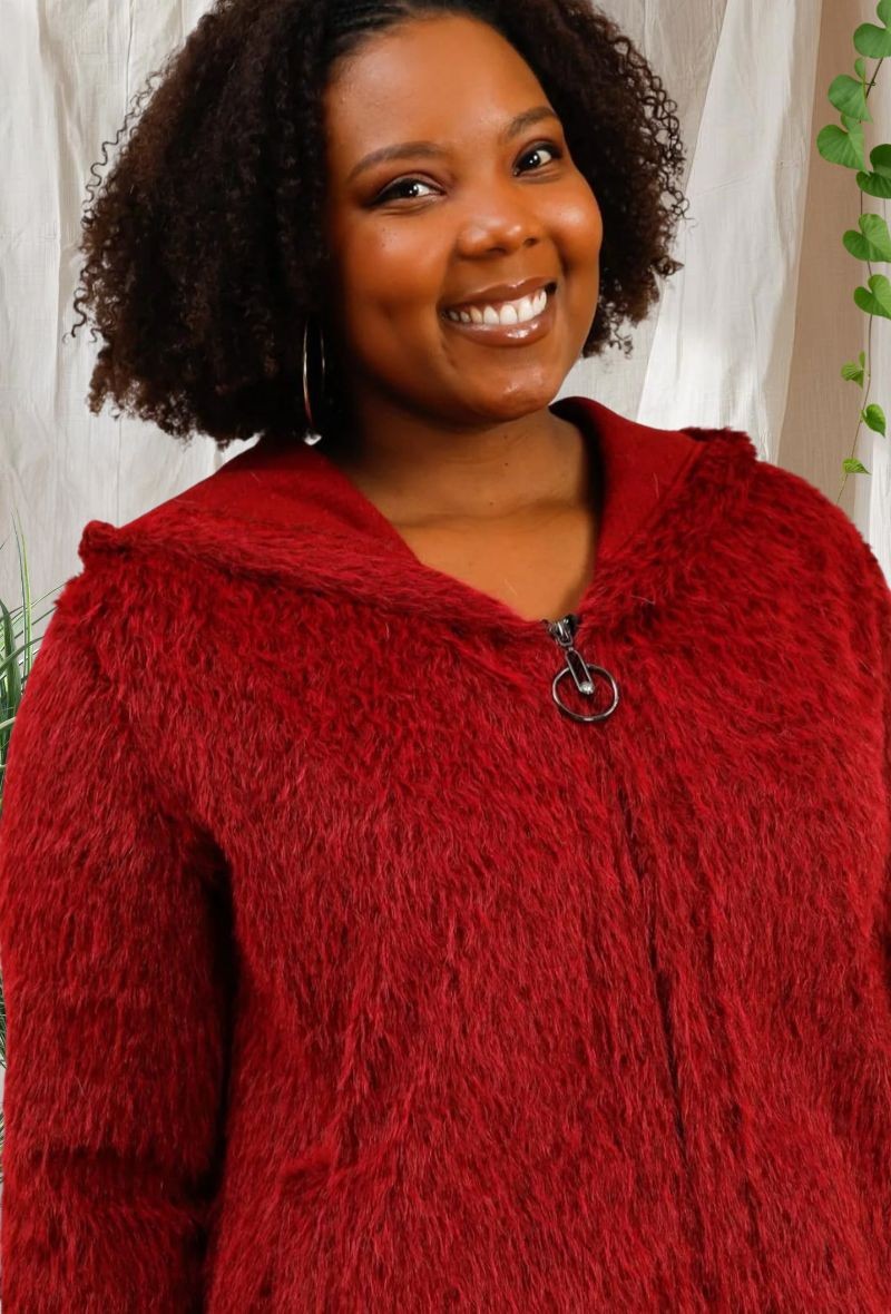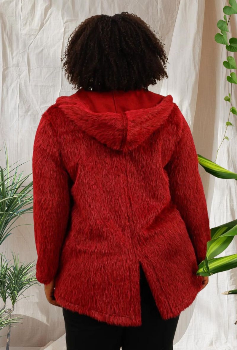Abrigo con capucha forrada en piel sintética, cierre de cremallera y tejido cálido, ideal para los días fríos de otoño e invierno. Cómodo, moderno y muy favorecedor.