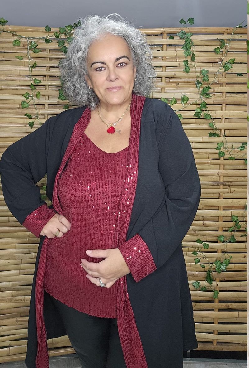 Kimono largo y abierto, sin cierre, con vivos de lentejuelas en la parte delantera. Ligero, elegante y perfecto para combinar con tus tops o blusas Princesa.