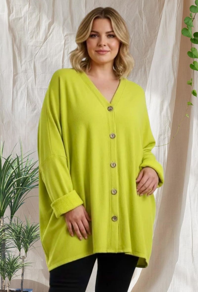 Cárdigan ultrasuave y extragrande, con botones delanteros, cuello en V y corte rectangular con hombros caídos. Lleva forro polar interior, ideal para ir calentita y cómoda.