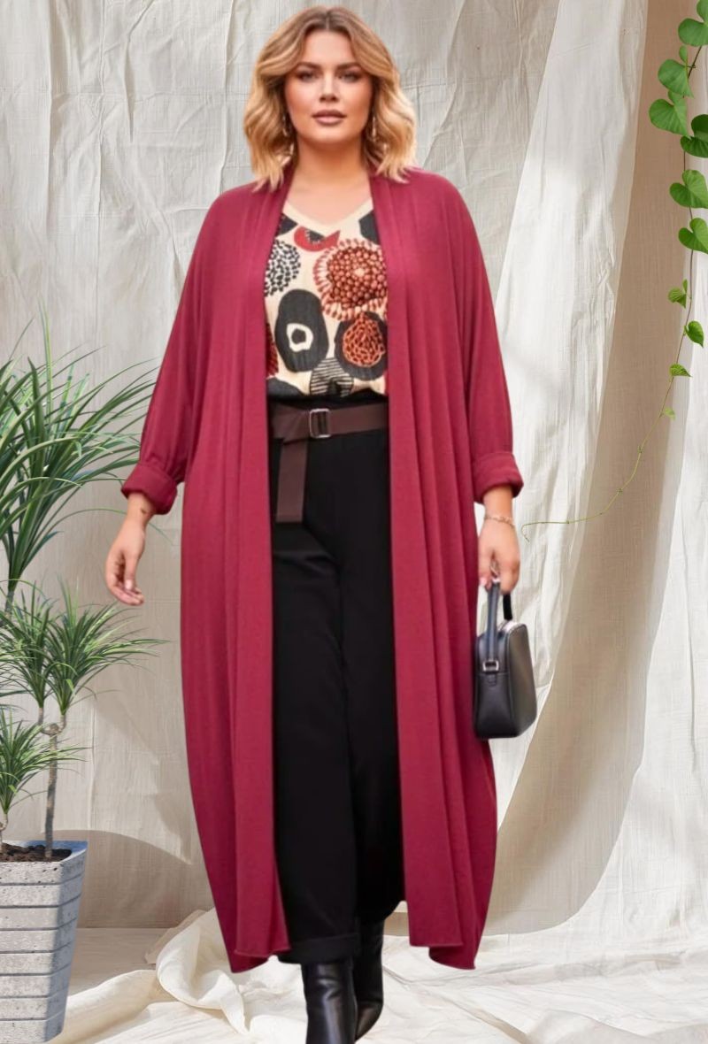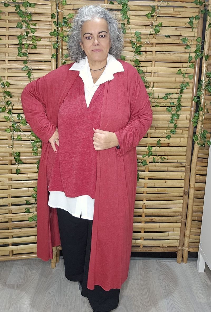 Cárdigan largo y recto de punto ultrasuave y elástico, con cuello drapeado abierto y mangas largas. Prenda cómoda, ligera y muy fácil de combinar para el día a día.