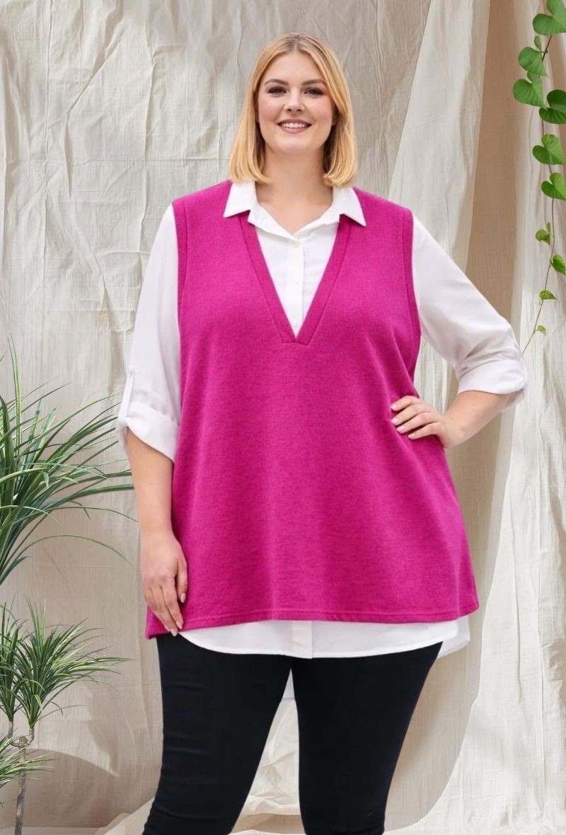 Chaleco fino sin mangas, con escote pronunciado en pico y bajo ligeramente acampanado.