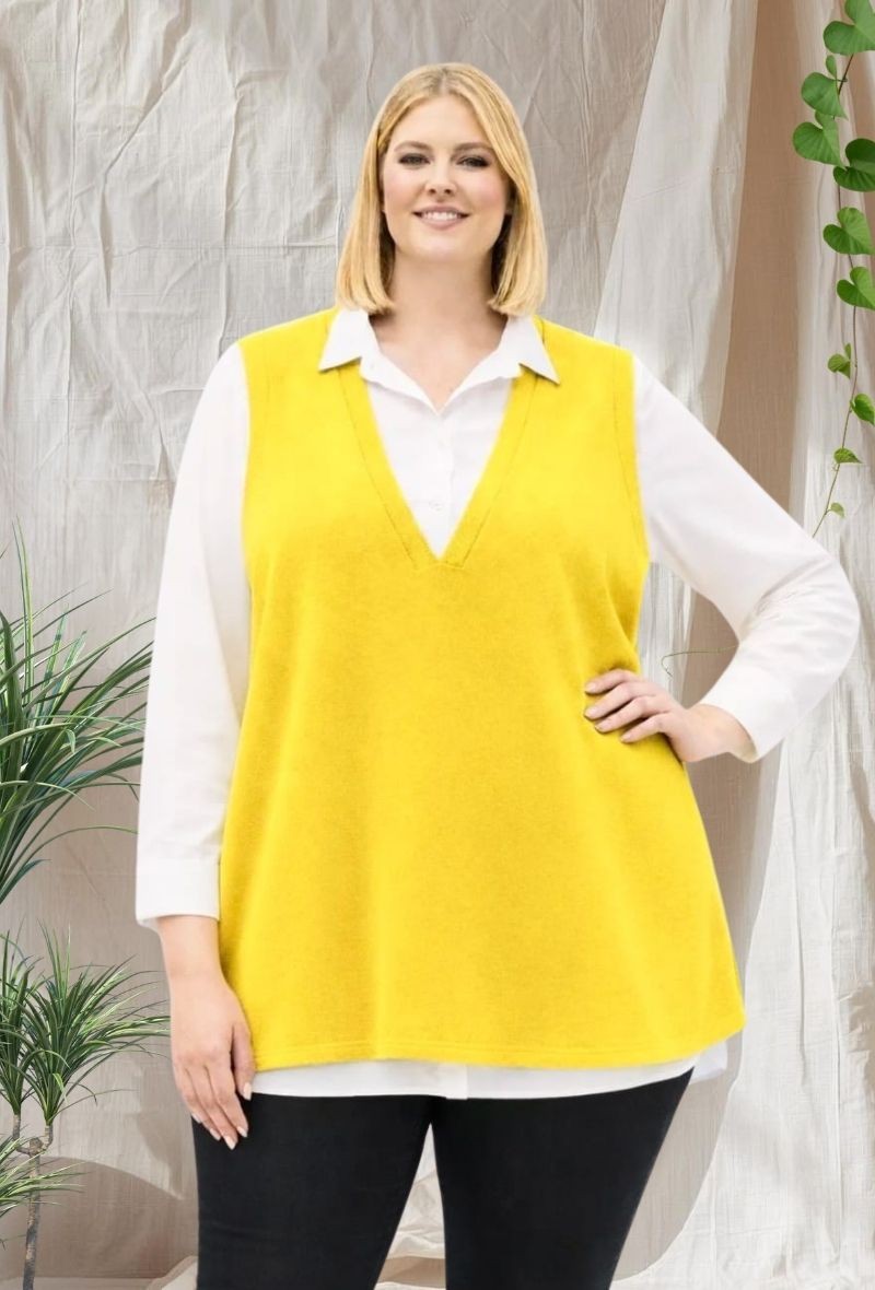 Chaleco fino sin mangas, con escote pronunciado en pico y bajo ligeramente acampanado.