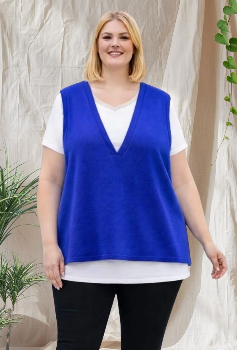 Chaleco fino sin mangas, con escote pronunciado en pico y bajo ligeramente acampanado.