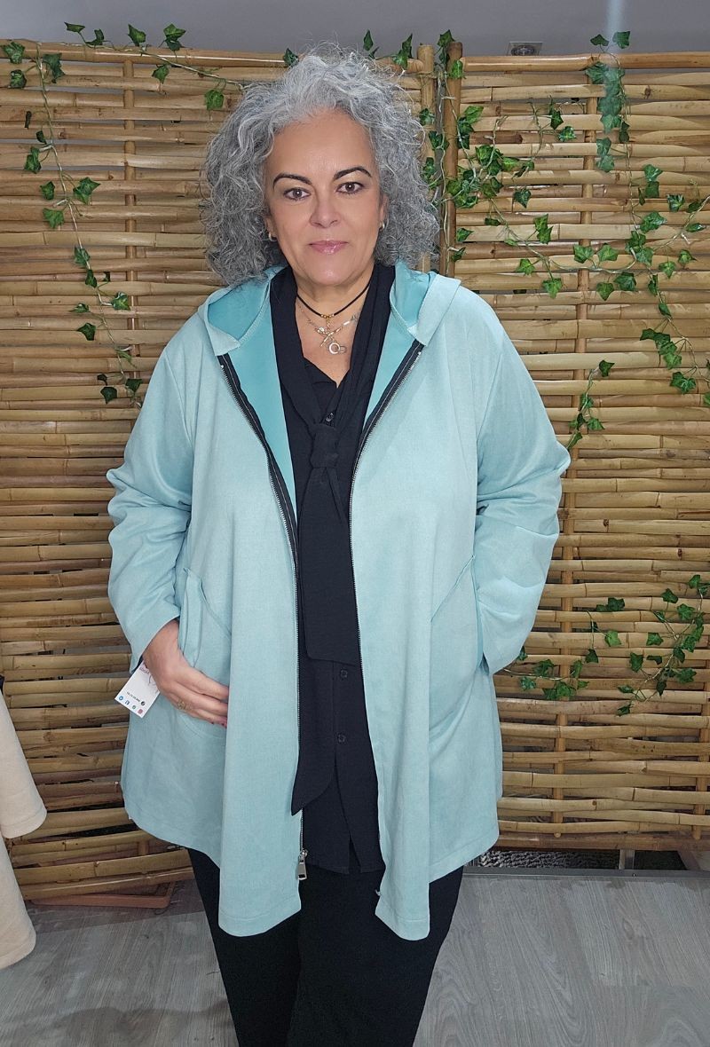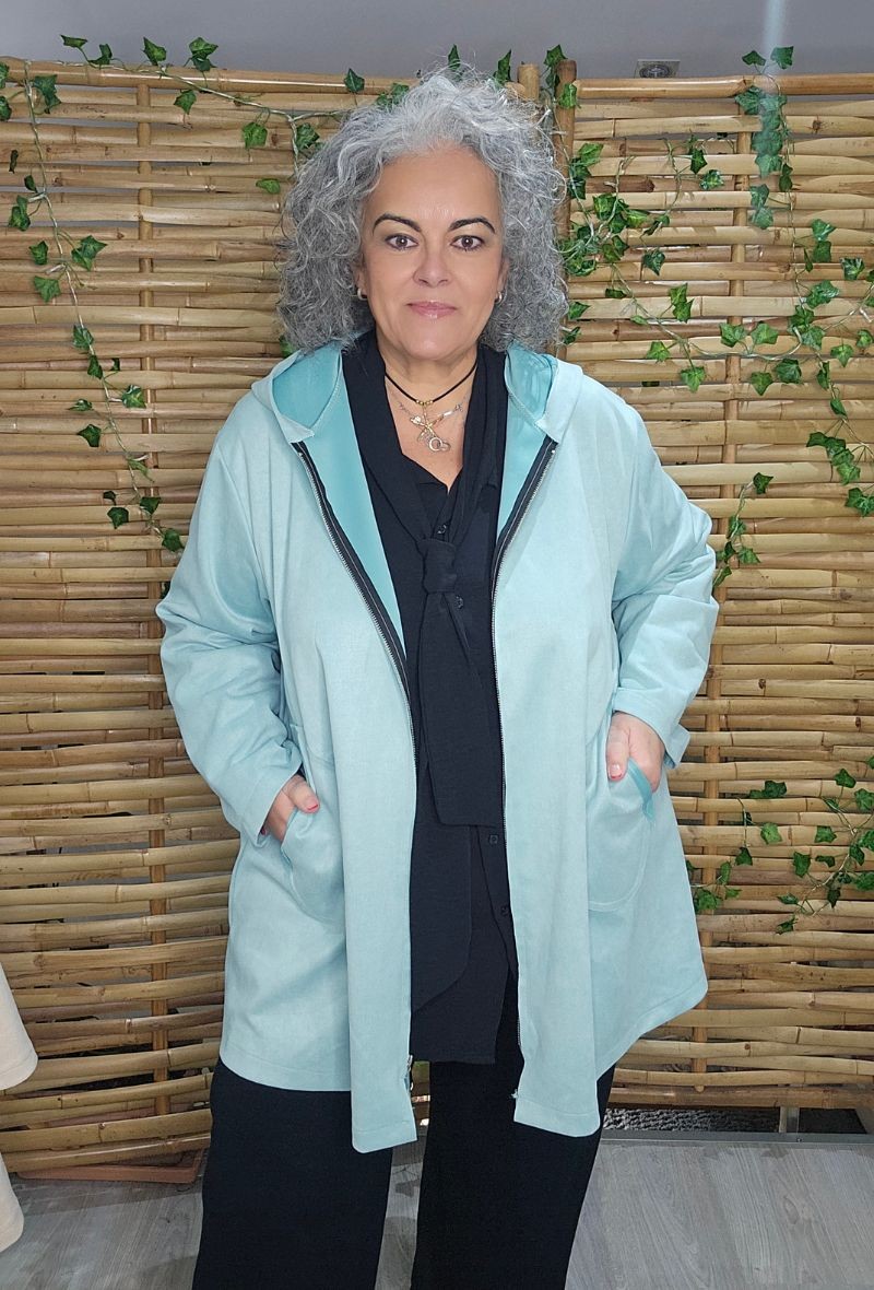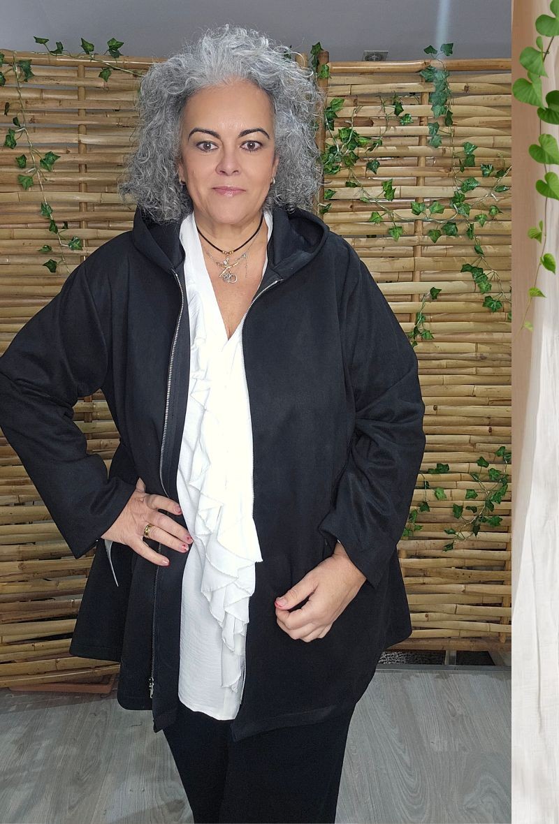 Chaqueta de antelina suave y elástica, con cremallera frontal y capucha, cómoda y muy favorecedora. Diseño amplio con caída fluida, ideal para looks casual o más arreglados.