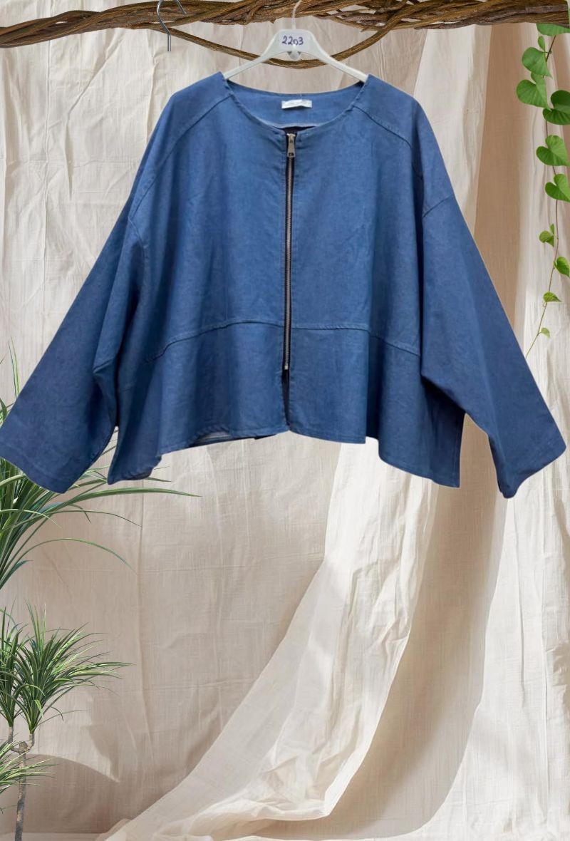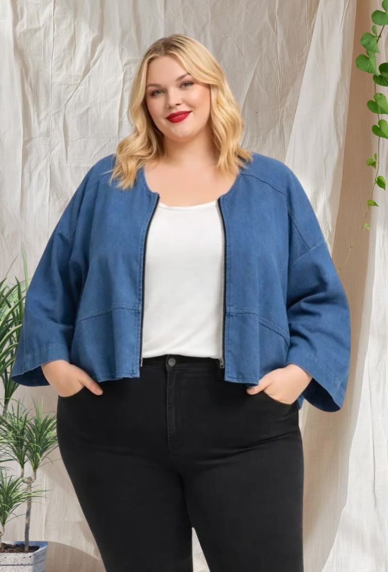 Chaqueta vaquera ligera y corta, con cuello redondo y diseño sin forro. Corte rectangular holgado con mangas ligeramente caídas, cómoda y fácil de combinar. Ideal para entretiempo y looks casual.