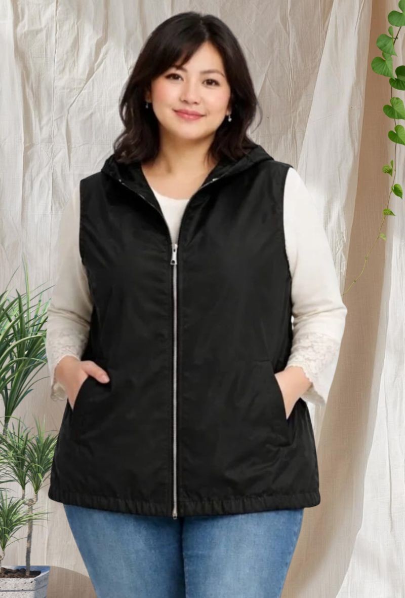Chaleco sin mangas con capucha y cremallera frontal, confeccionado en tejido tipo gabardina con bajo elástico para un mejor ajuste. Incluye dos bolsillos laterales discretos. Tejido repelente al agua (no impermeable) y sin forro, perfecto para entretiempo.