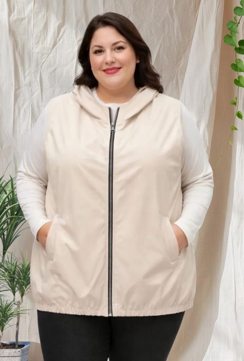 Chaleco sin mangas con capucha y cremallera frontal, confeccionado en tejido tipo gabardina con bajo elástico para un mejor ajuste. Incluye dos bolsillos laterales discretos. Tejido repelente al agua (no impermeable) y sin forro, perfecto para entretiempo.