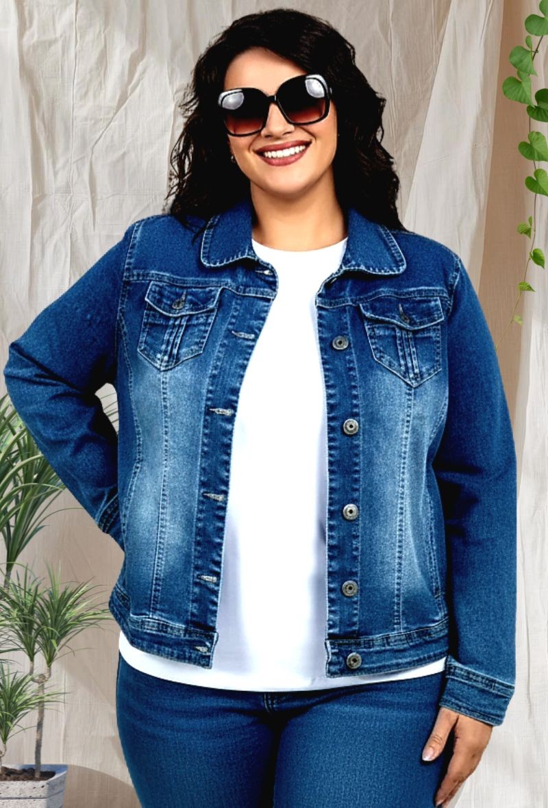Cazadora vaquera marca Carissal, de fabricación española, diseñada para tallas extra. Modelo clásico con cierre de botones, bolsillos delanteros y tejido cómodo que se adapta sin perder estructura. Perfecta para combinar con vestidos, camisetas o jeans. Disponible en tallas extra.