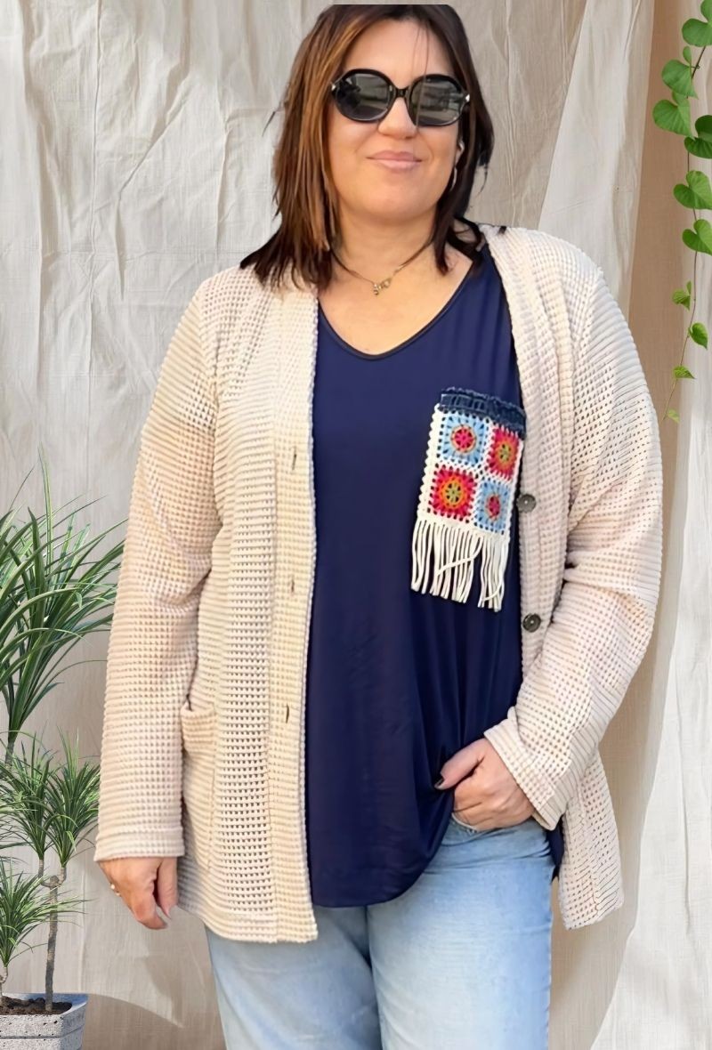 descripcion productoChaqueta de rejilla calada ligera y versátil, ideal para entretiempo. Diseño abierto con botones frontales y corte recto favorecedor. Perfecta para llevar sobre camisetas, vestidos o looks casual. Disponible en varios colores. Aporta un toque moderno sin dar calor.