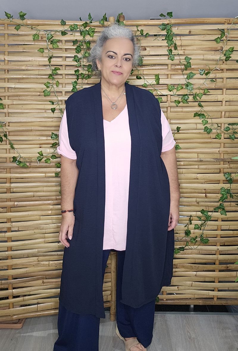 Chaleco largo sin mangas con corte fluido y abierto, ideal para completar cualquier look. Diseño ligero y cómodo que estiliza la silueta y aporta movimiento. Perfecto para llevar sobre camisetas, blusas o vestidos.