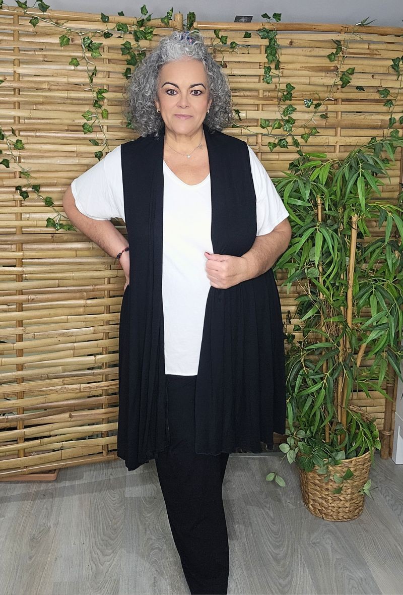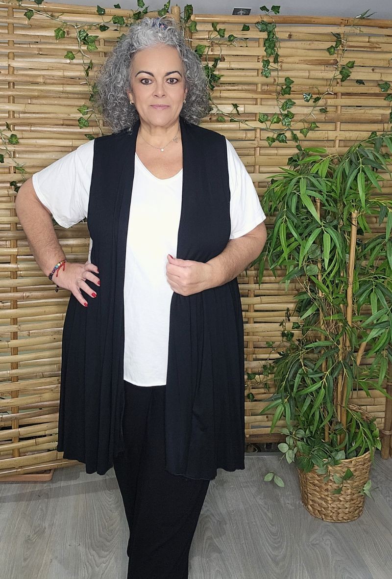 Chaleco largo de punto con caída fluida y diseño abierto que estiliza la silueta. Ligero, cómodo y muy versátil, ideal para completar cualquier look.