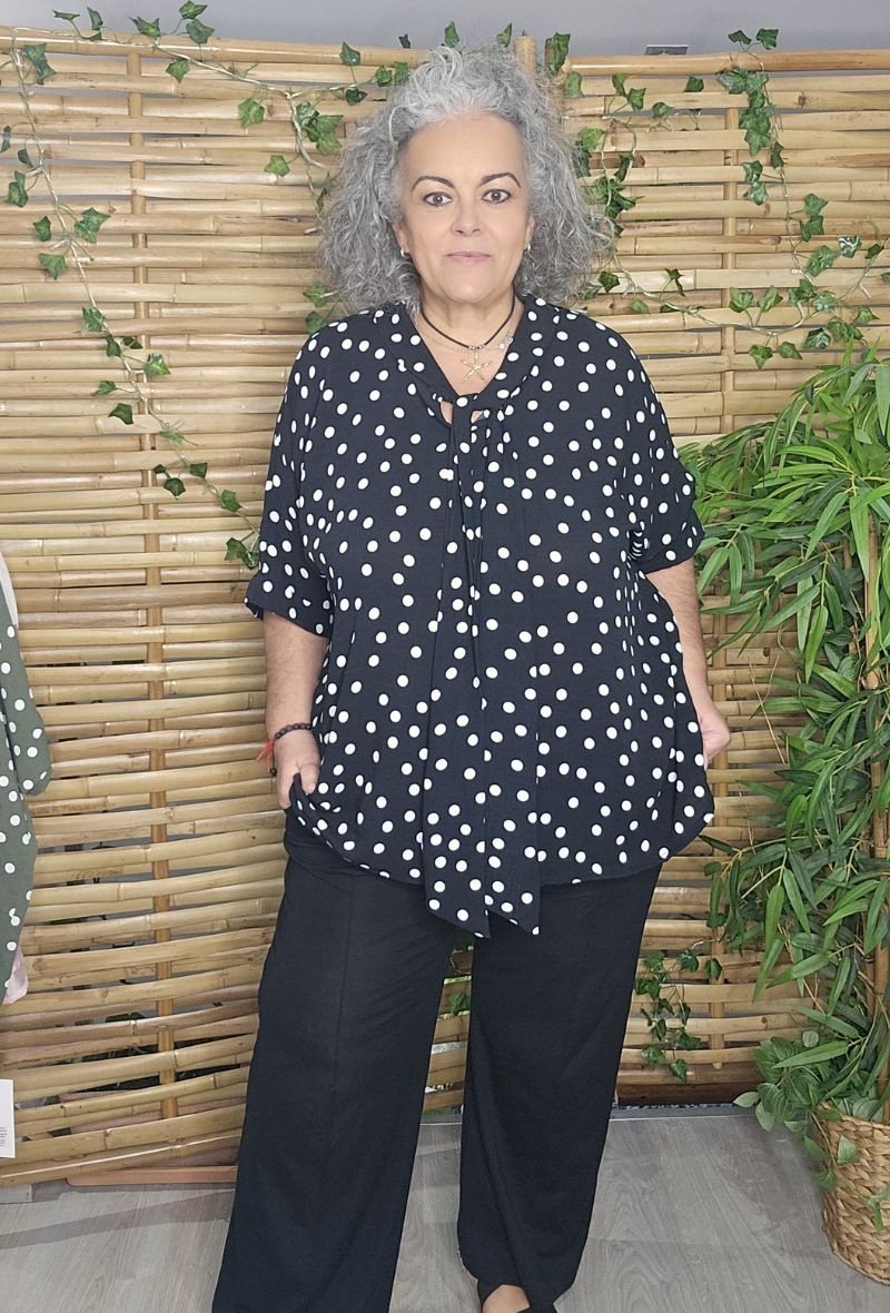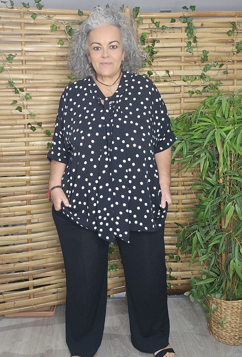 Blusa de corte cuadrado con diseño fluido y cómodo que no marca. Estampado de lunares clásicos y detalle de lazada en el escote que aporta un toque femenino. Tejido ligero con caída suave, ideal para looks versátiles y favorecedores.