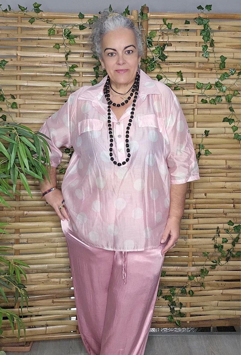 Camisa fluida con estampado de lunares grandes y estilo desenfadado. Con cuello camisero, tapeta de botones y bolsillos delanteros que aportan un toque casual. Tejido suave tipo tencel, ligero y con caída que no marca y resulta muy cómodo.