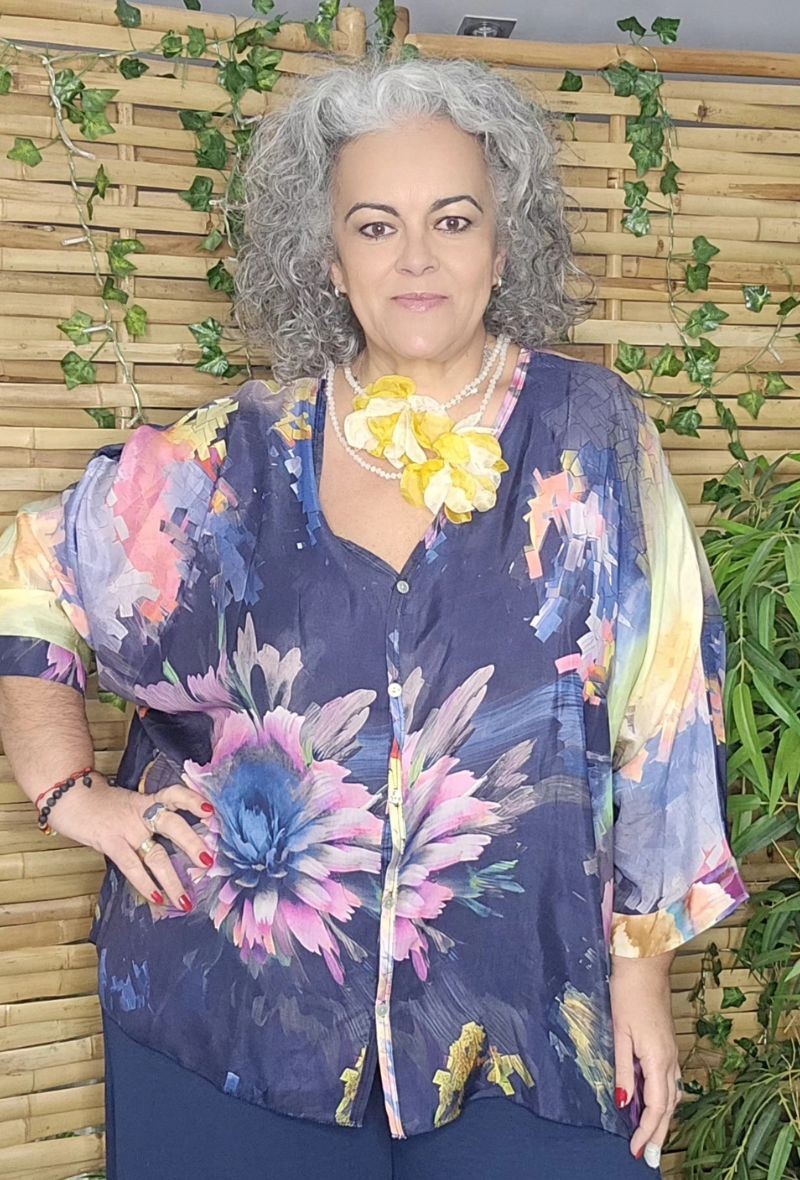 Blusa asedada con estampado en tonos vibrantes y caída fluida. Tejido ligero y suave que aporta un toque elegante sin renunciar a la comodidad. Corte amplio que favorece y estiliza.