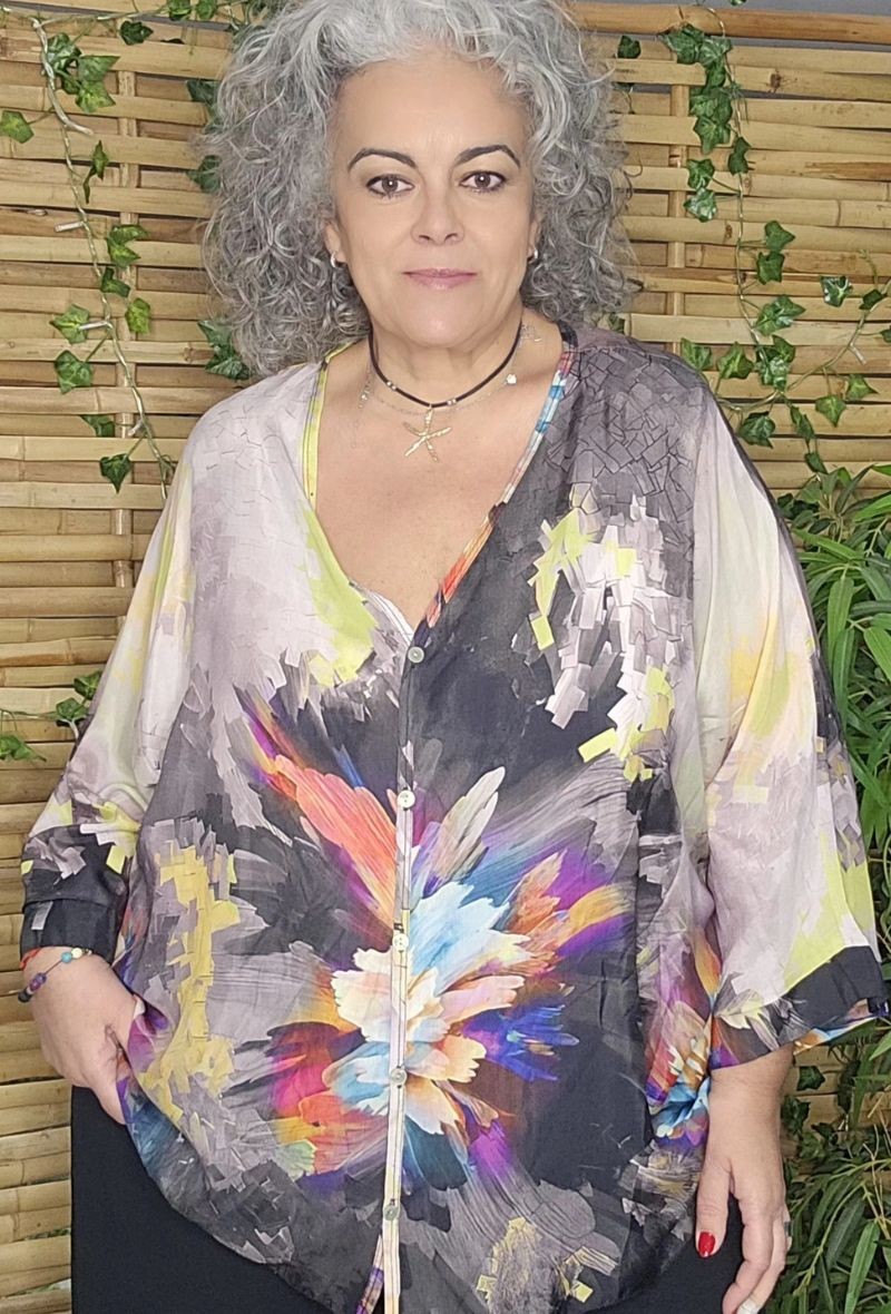 Blusa asedada con estampado en tonos vibrantes y caída fluida. Tejido ligero y suave que aporta un toque elegante sin renunciar a la comodidad. Corte amplio que favorece y estiliza.