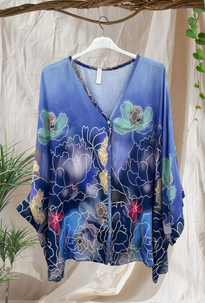 Blusa asedada con estampado en tonos vibrantes y caída fluida. Tejido ligero y suave que aporta un toque elegante sin renunciar a la comodidad. Corte amplio que favorece y estiliza.