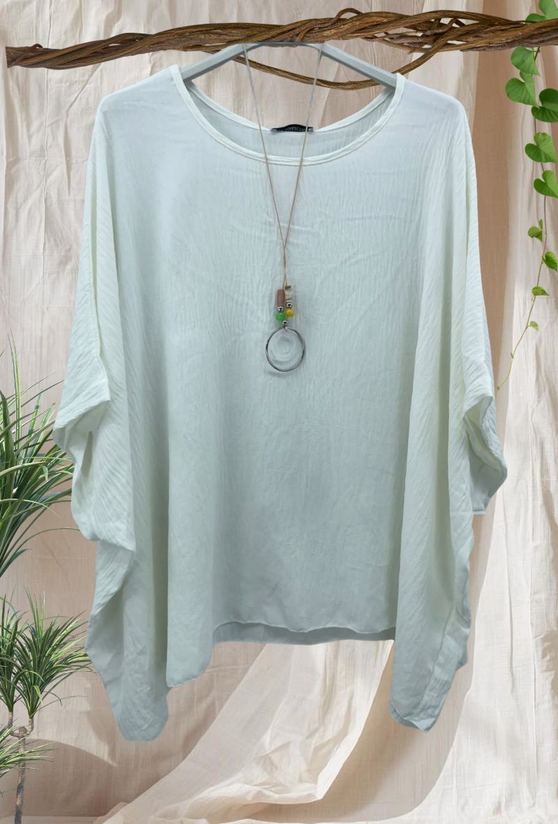 Con cuello redondeado, manga corta y un diseño muy amplio, es la más ancha de nuestra colección de blusas blancas.