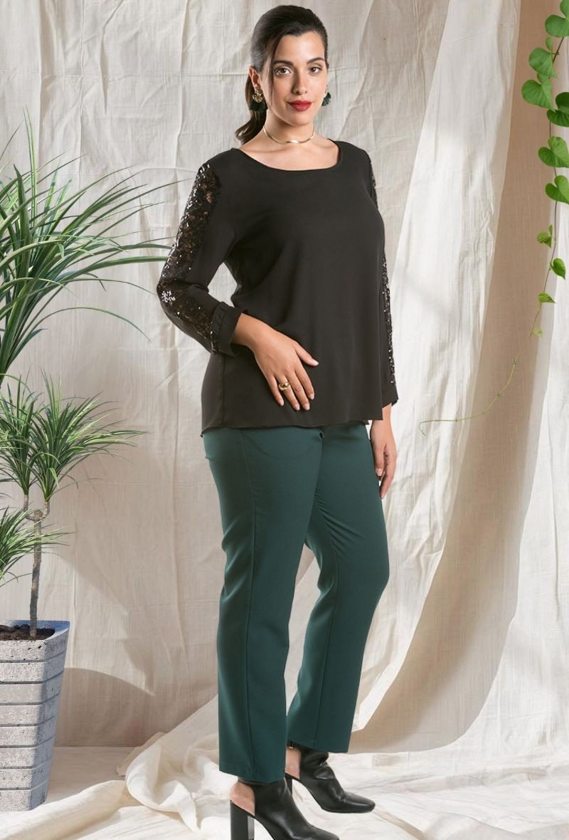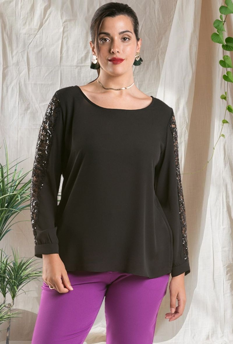 Blusa lisa de gasa con cuello redondo y mangas largas abullonadas. Detalle de encaje de lentejuelas en las mangas y puños para un acabado elegante.