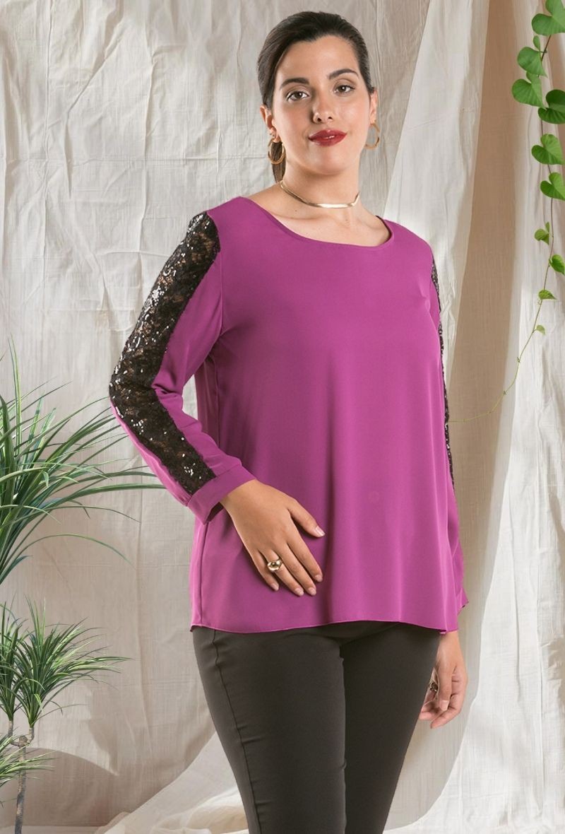 Blusa lisa de gasa con cuello redondo y mangas largas abullonadas. Detalle de encaje de lentejuelas en las mangas y puños para un acabado elegante.