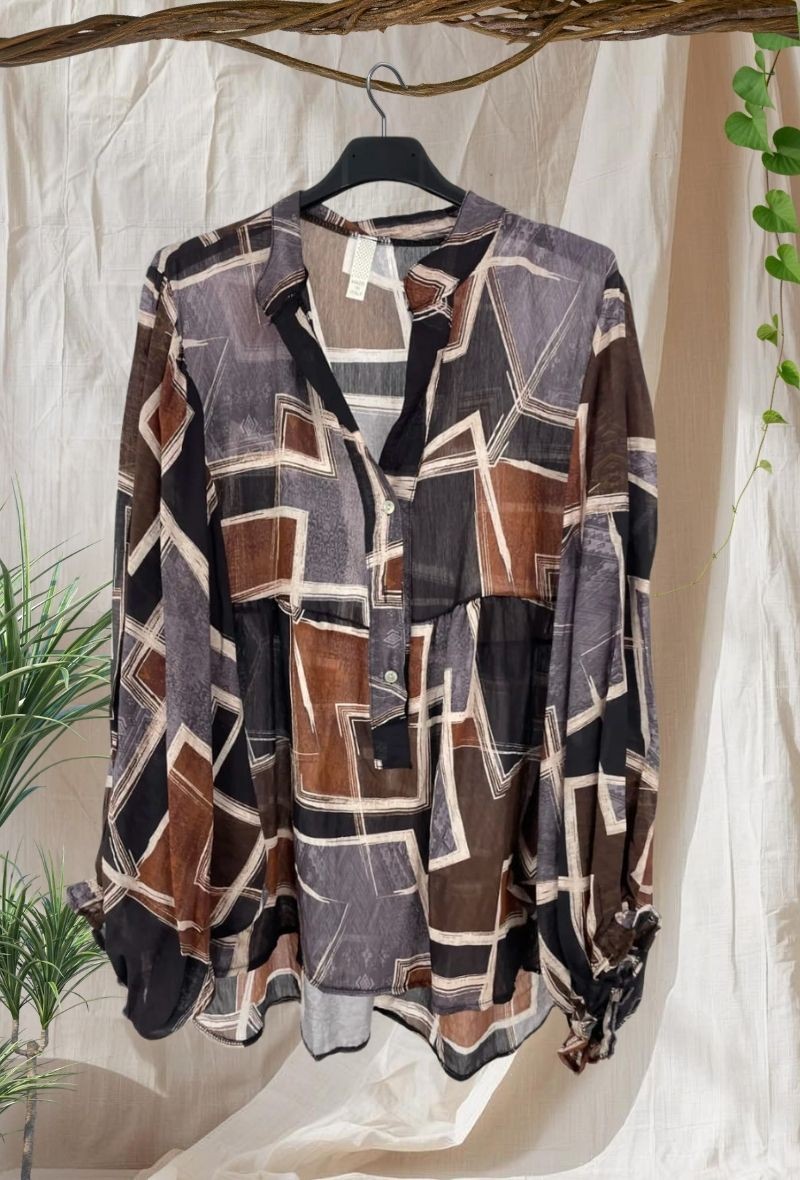 Blusa de tencel suave y fluido con manga abullonada y puño elástico. Presenta cuello mao con solapa abotonada y diseño más largo en la parte trasera. Ligera, cómoda y muy favorecedora.