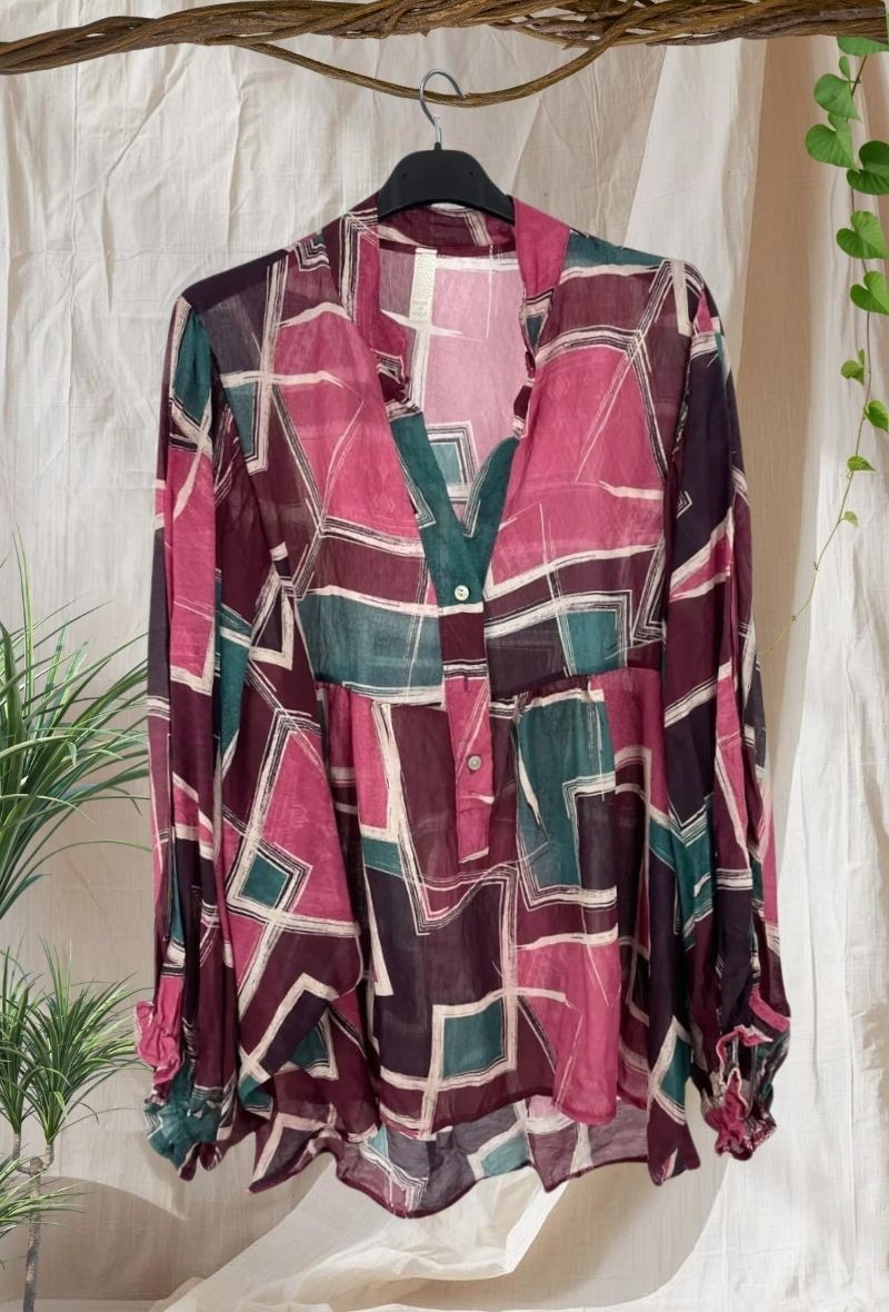 Blusa de tencel suave y fluido con manga abullonada y puño elástico. Presenta cuello mao con solapa abotonada y diseño más largo en la parte trasera. Ligera, cómoda y muy favorecedora.