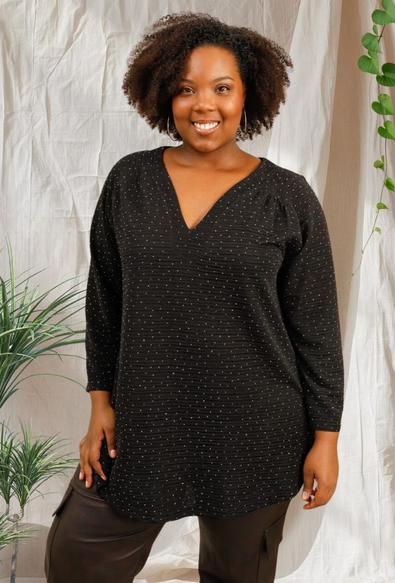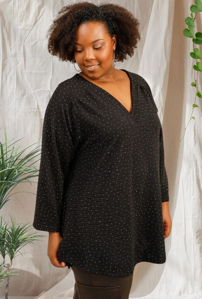 Túnica amplia y fluida, con cuello en V decorado con strass y mangas 3/4. Su tejido elástico y ligero la hace perfecta para el otoño, ideal para un look chic y desenfadado.