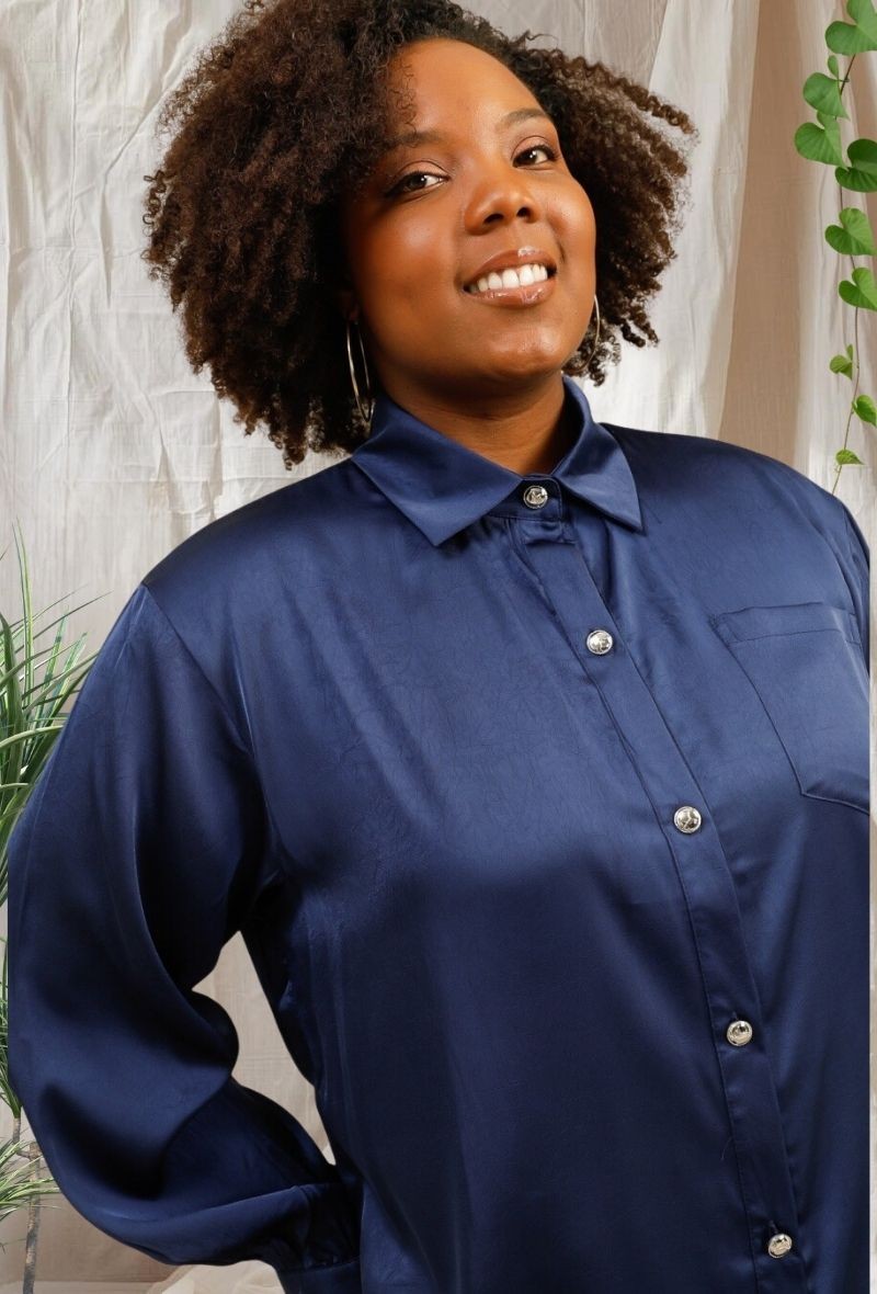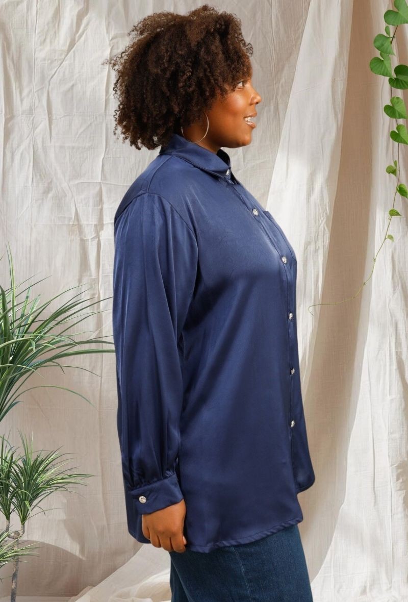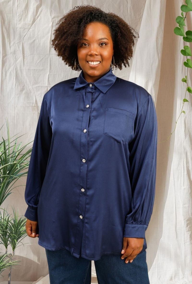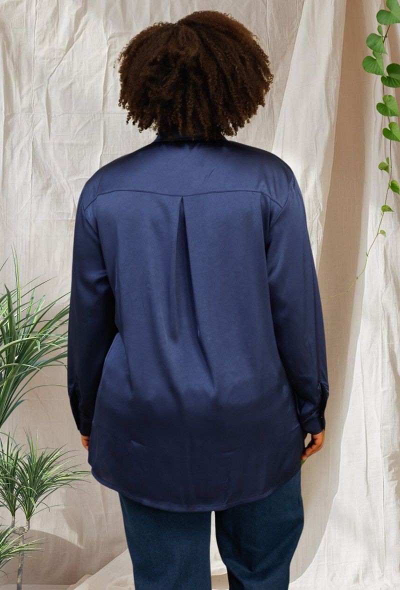 Camisa de satén suave y fluido, abotonada en la parte delantera y con puños clásicos. Una prenda versátil y elegante, ideal para el día a día o para crear looks más sofisticados.