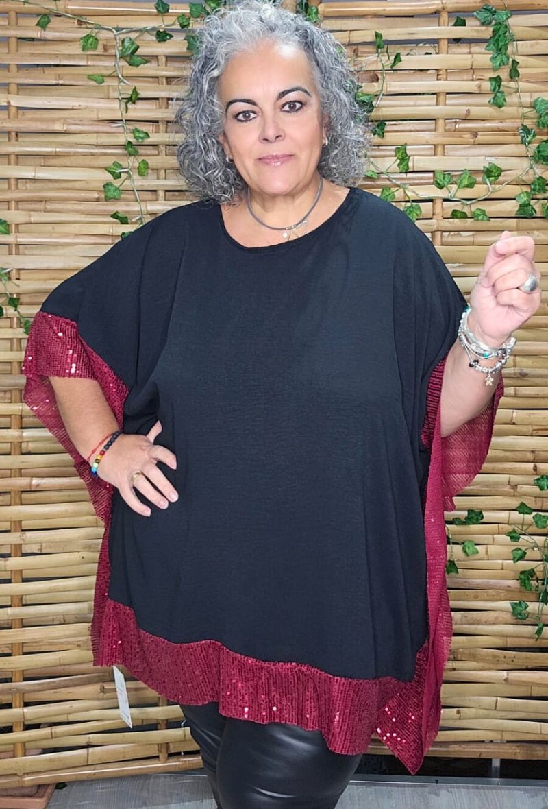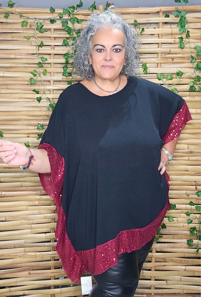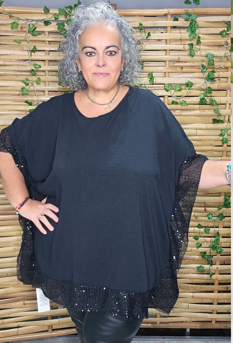 Cacasa cuadrada oversite, sin cierre, con vivos de lentejuelas en todo el borde. Ligero, elegante y perfecto para combinar con tus tops, kimono o blusas Princesa.