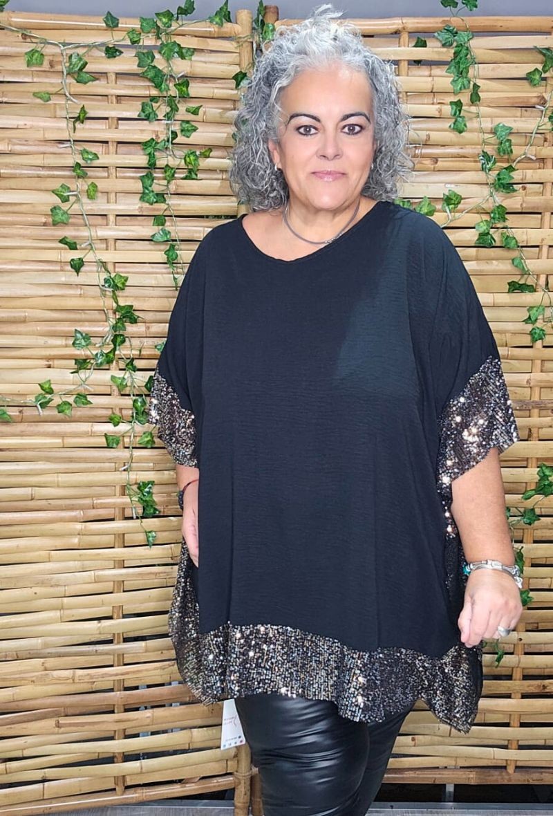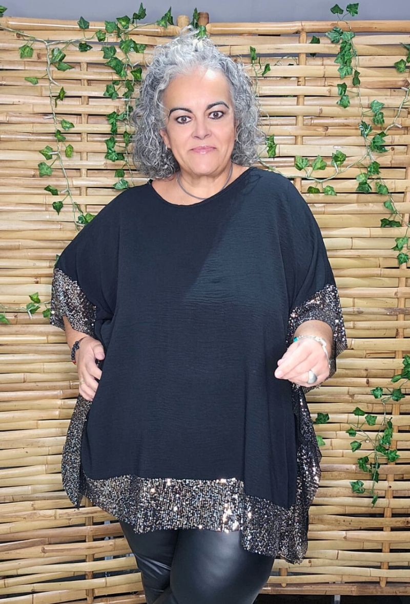 Cacasa cuadrada oversite, sin cierre, con vivos de lentejuelas en todo el borde. Ligero, elegante y perfecto para combinar con tus tops, kimono o blusas Princesa.