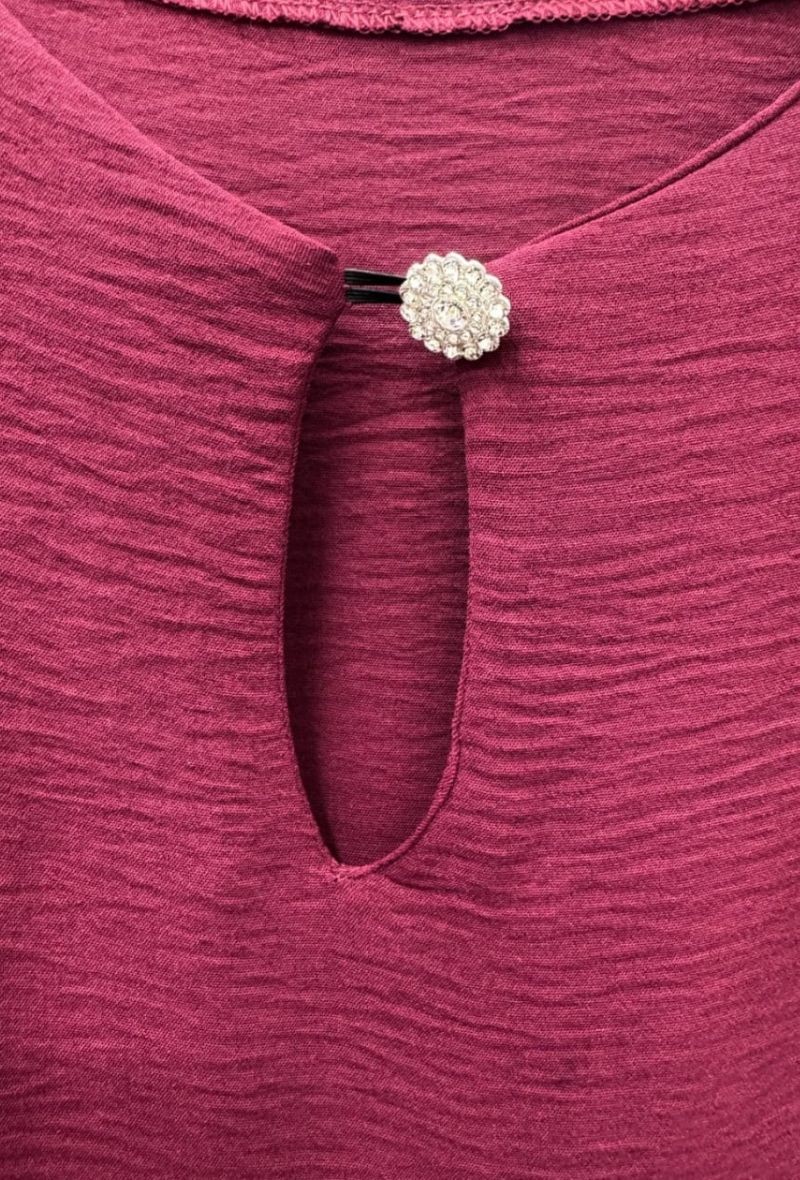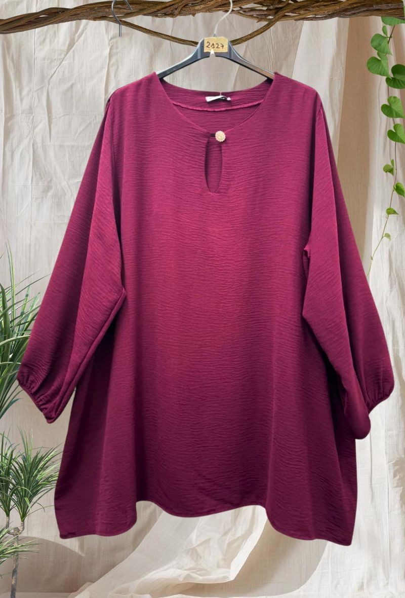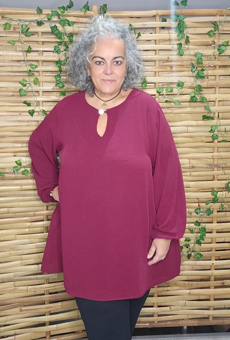 Túnica larga y fluida en crepé de viscosa suave, con escote de lágrima y botón joya. Mangas ligeramente abullonadas con puños elásticos. Cómoda, elegante y muy favorecedora.