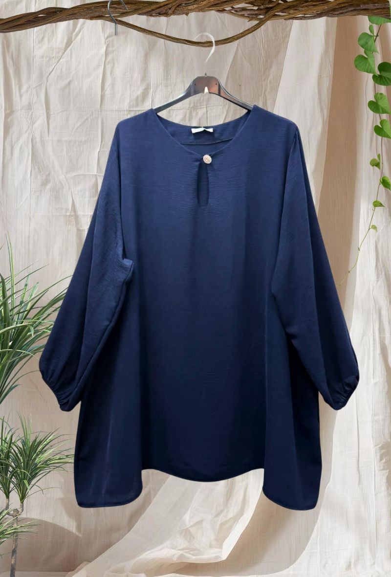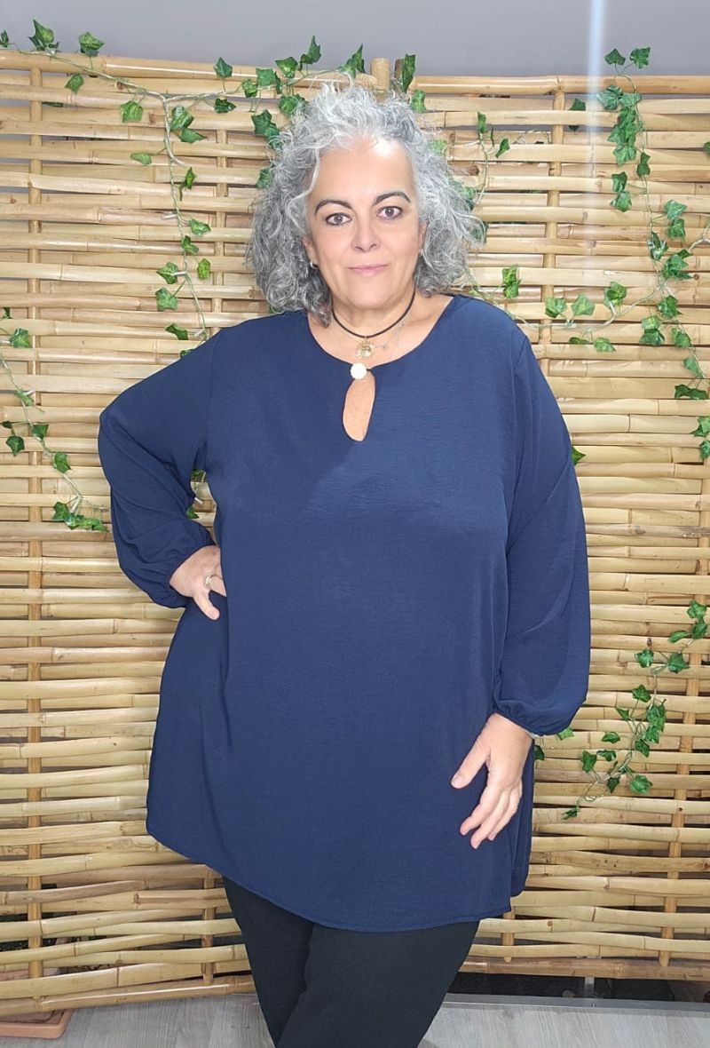 Túnica larga y fluida en crepé de viscosa suave, con escote de lágrima y botón joya. Mangas ligeramente abullonadas con puños elásticos. Cómoda, elegante y muy favorecedora.