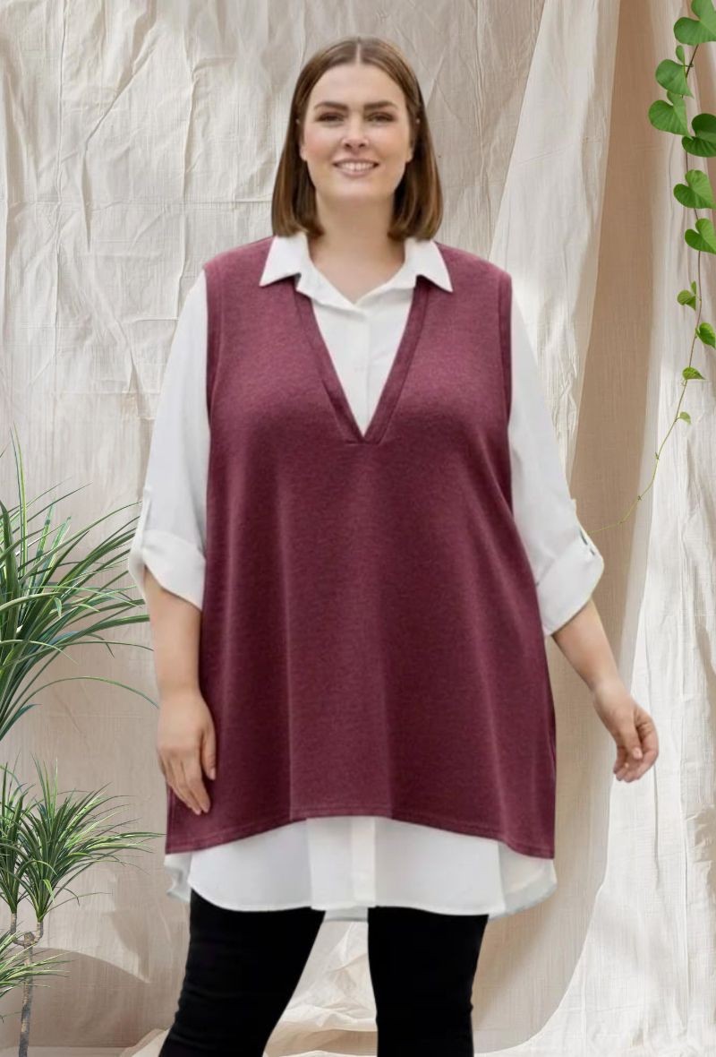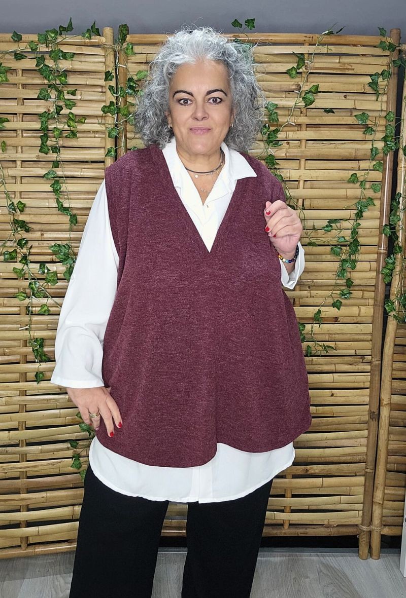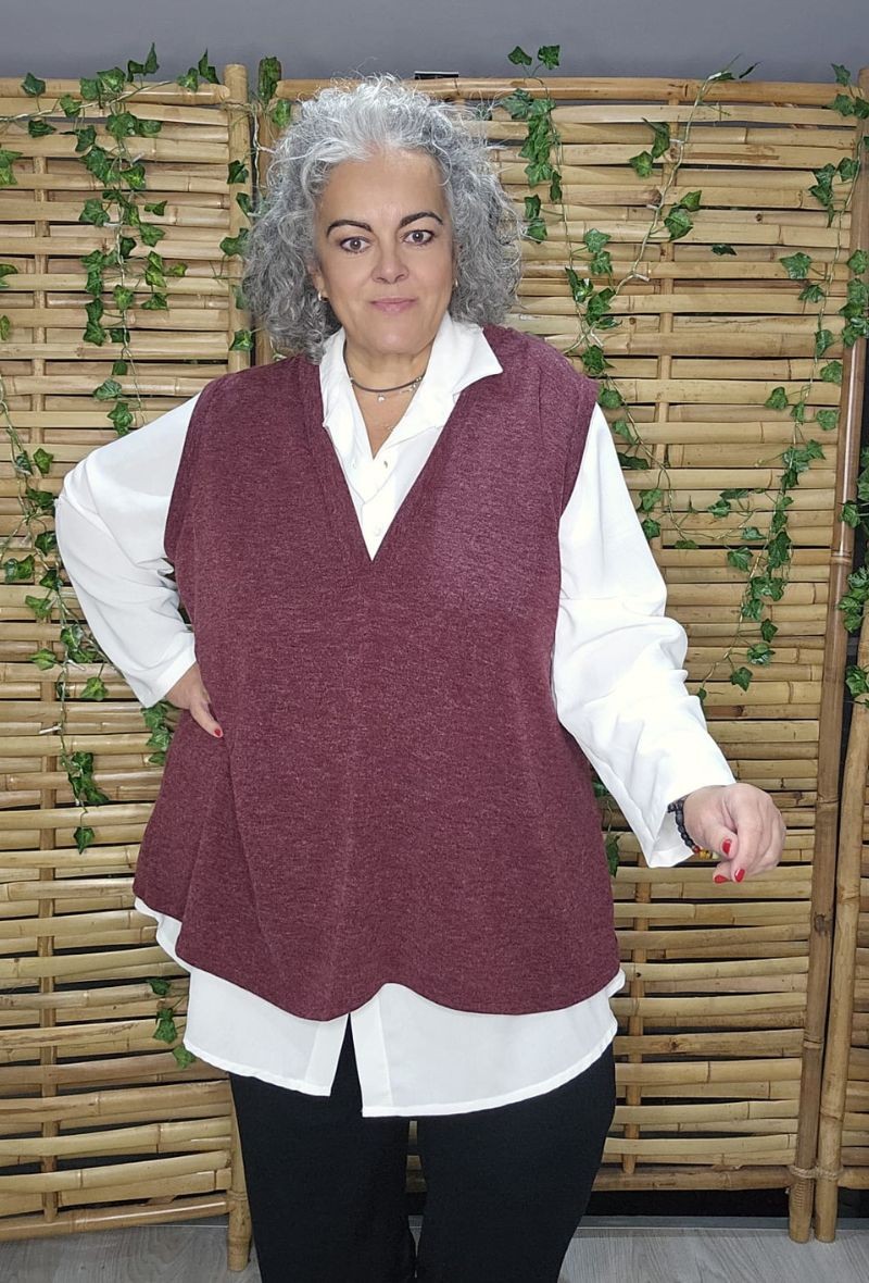 Conjunto de dos piezas separadas: suéter oversize de punto sin mangas y camisa blanca fluida en crepé de viscosa. Un look moderno, cómodo y muy favorecedor para cualquier ocasión.