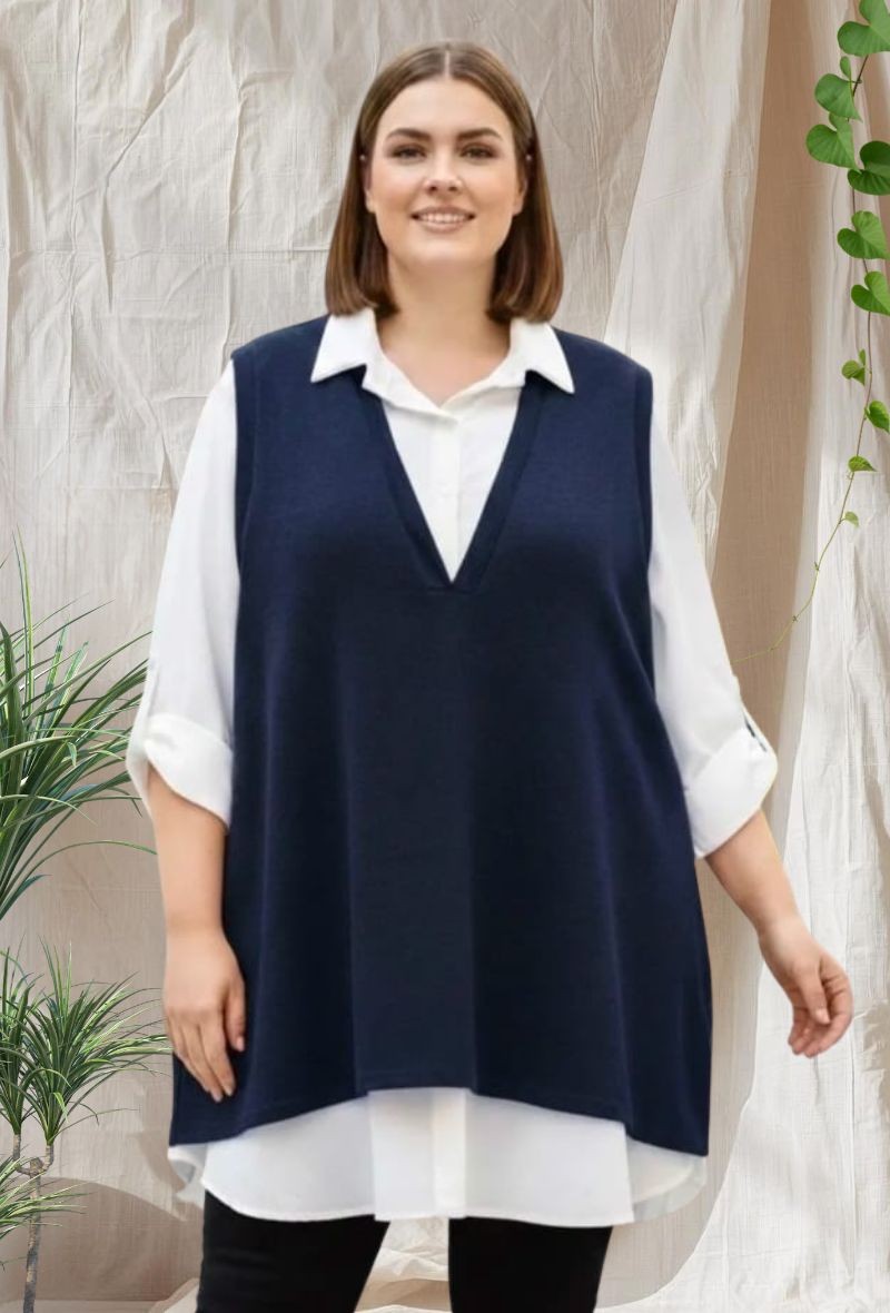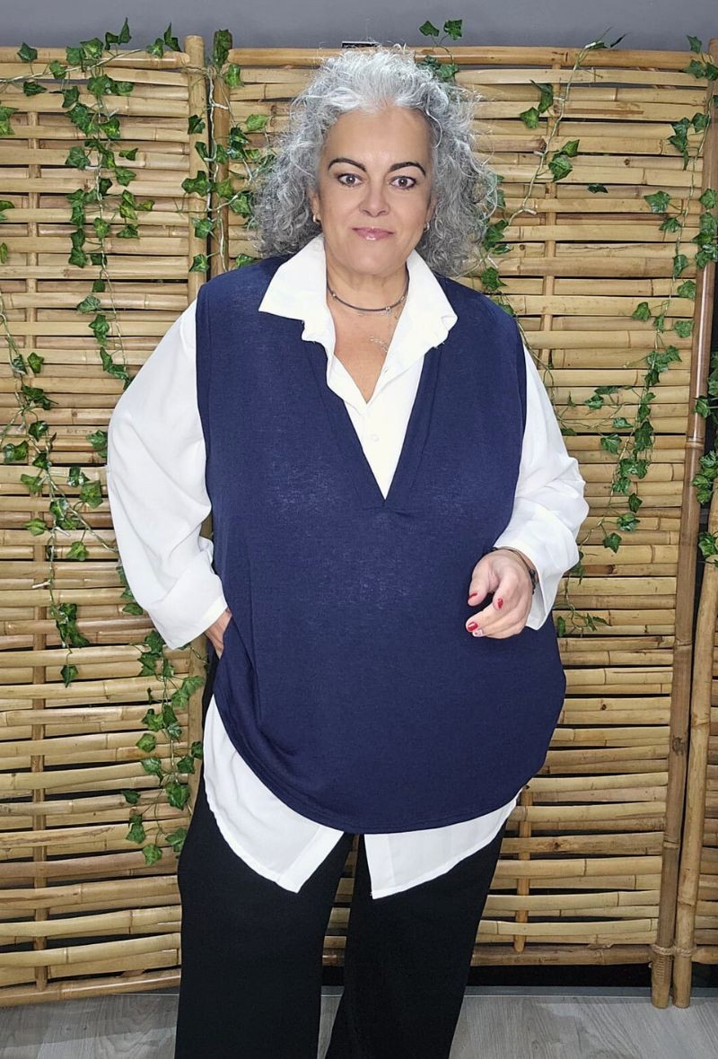 Conjunto de dos piezas separadas: suéter oversize de punto sin mangas y camisa blanca fluida en crepé de viscosa. Un look moderno, cómodo y muy favorecedor para cualquier ocasión.