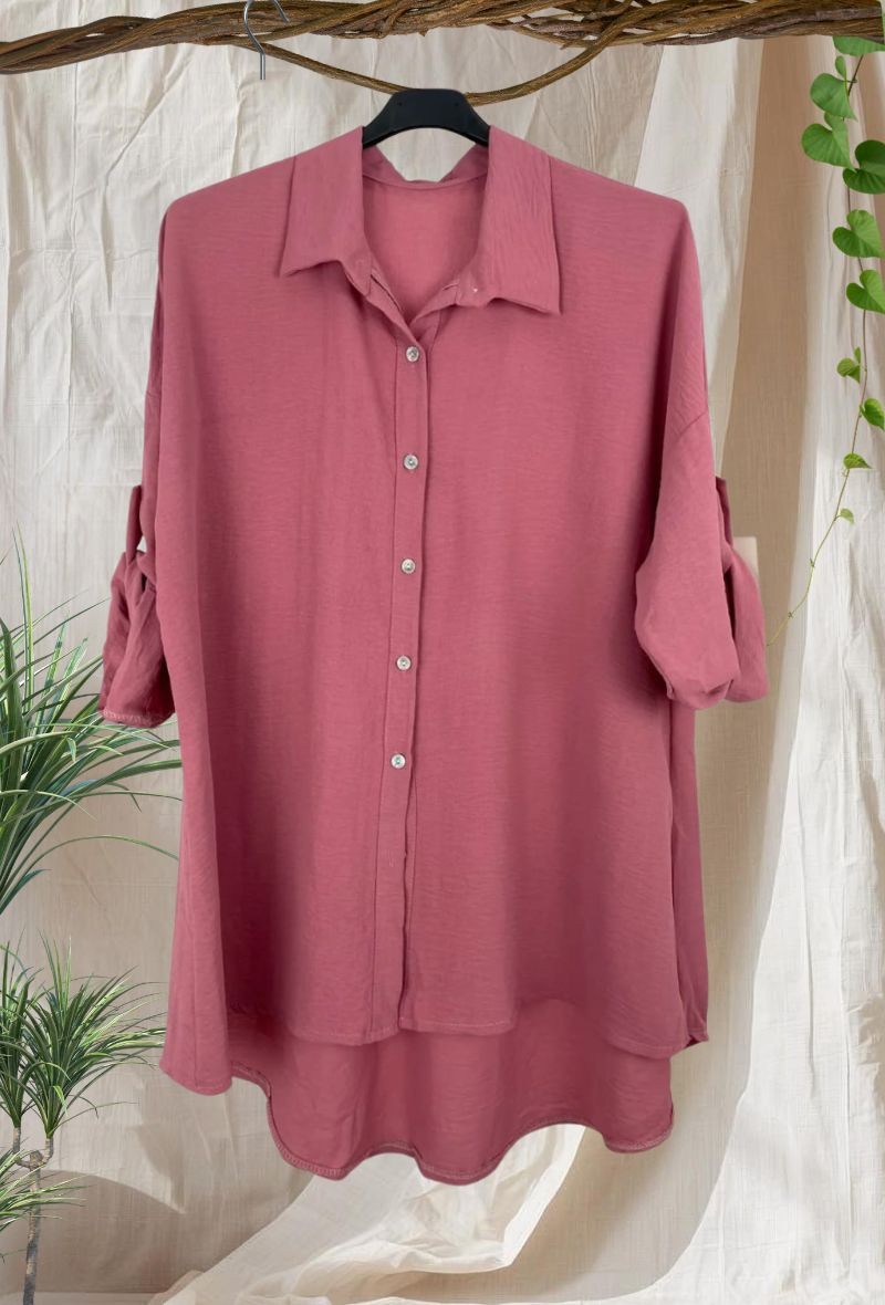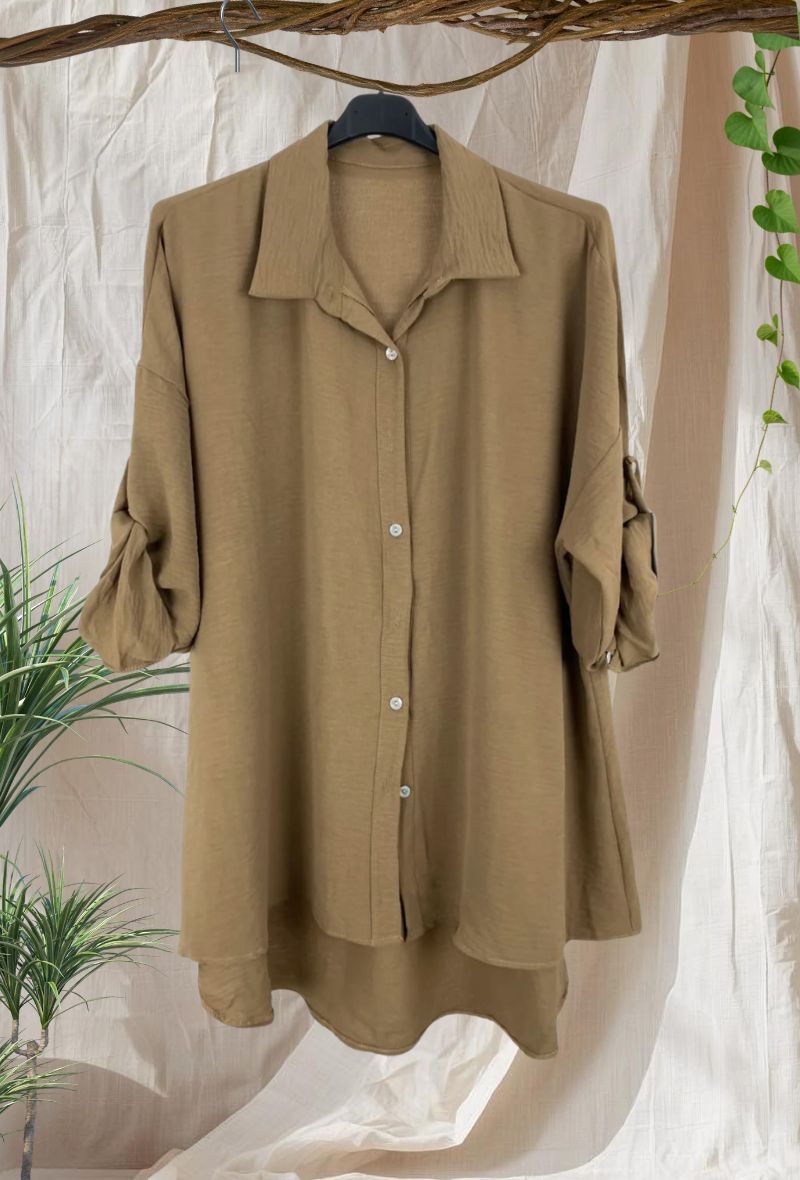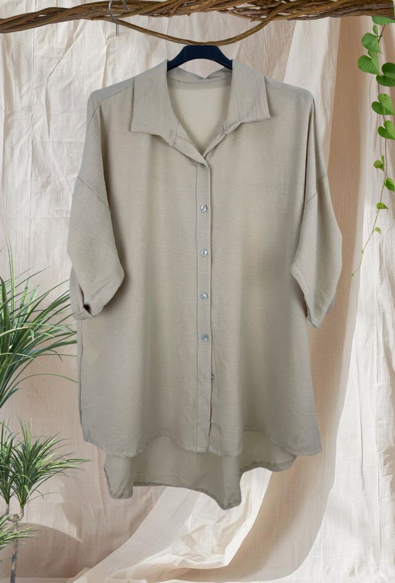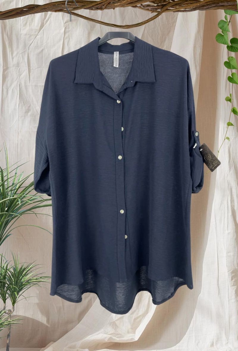 Camisa larga abotonada de tejido crepe súper suave, con mucha caída. Manga larga que puede recogerse a 3/4, ideal para looks cómodos y versátiles.
