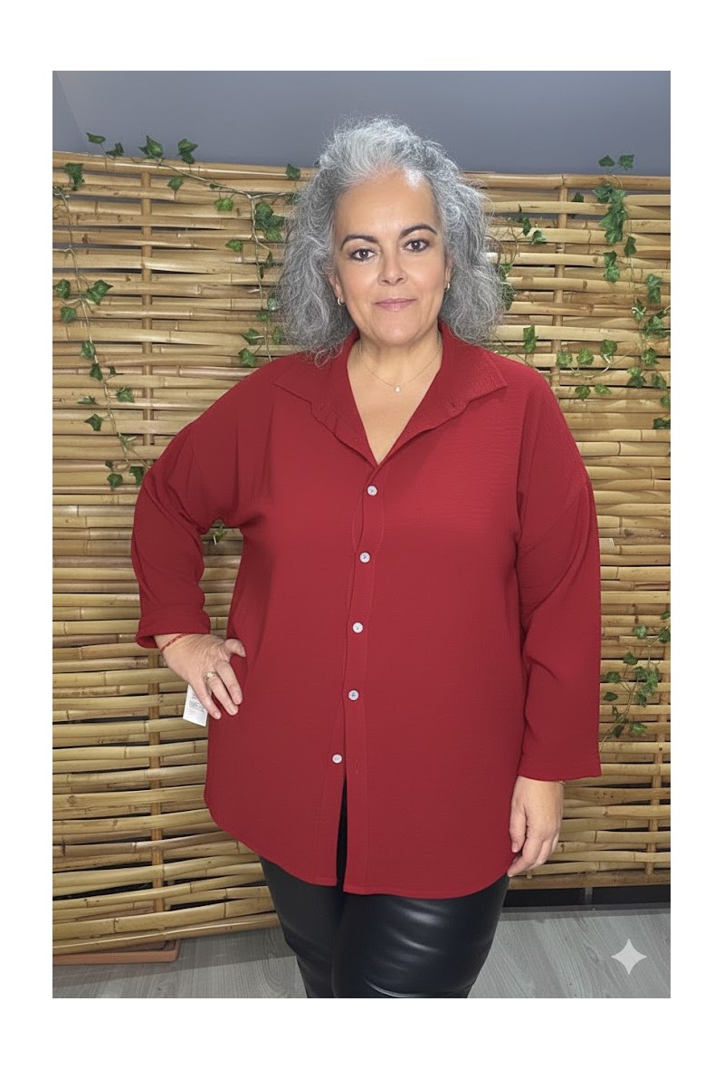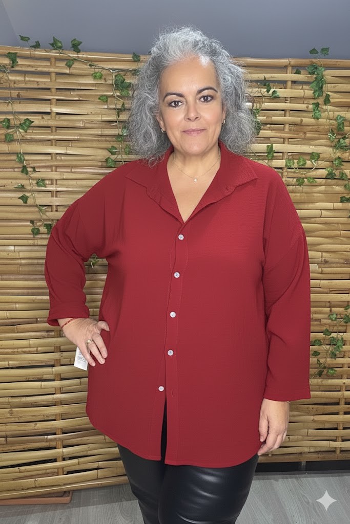 Camisa básica abotonada de tejido suave, con manga larga que puede recogerse y ajustarse con botón.