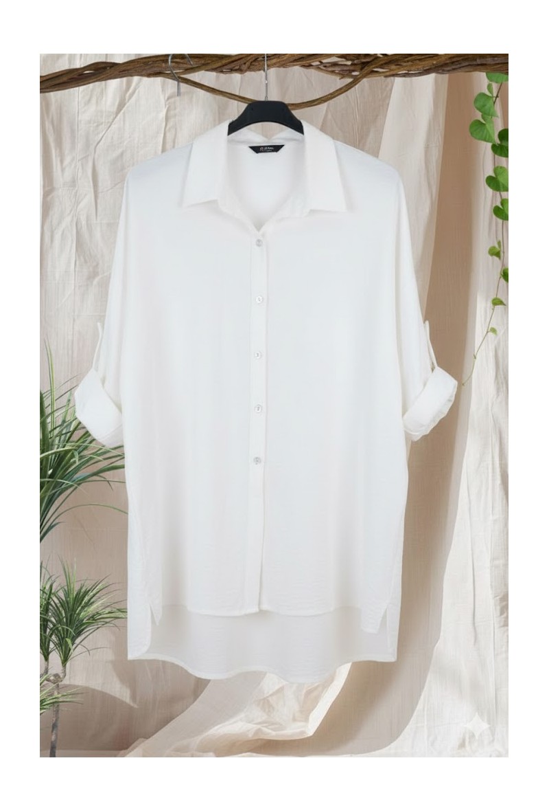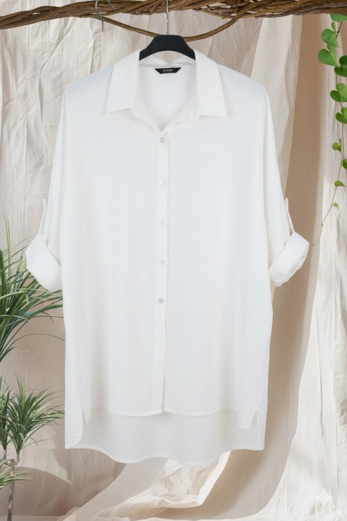 Camisa larga abotonada de tejido crepe súper suave, con mucha caída. Manga larga que puede recogerse a 3/4, ideal para looks cómodos y versátiles.