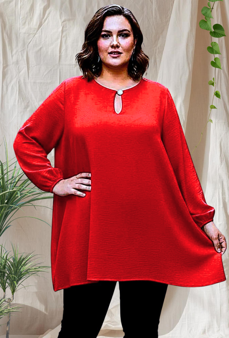 Túnica larga y fluida en crepé de viscosa suave, con escote de lágrima y botón joya. Mangas ligeramente abullonadas con puños elásticos. Cómoda, elegante y muy favorecedora.