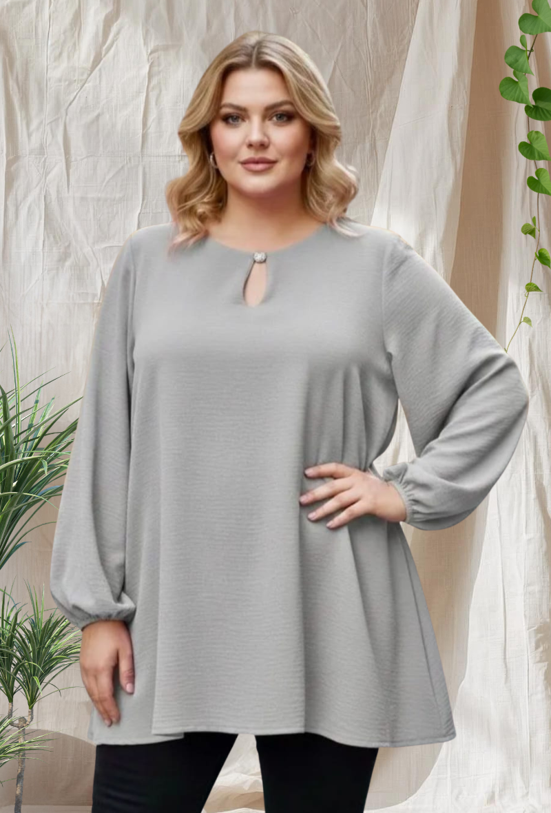 Túnica larga y fluida en crepé de viscosa suave, con escote de lágrima y botón joya. Mangas ligeramente abullonadas con puños elásticos. Cómoda, elegante y muy favorecedora.