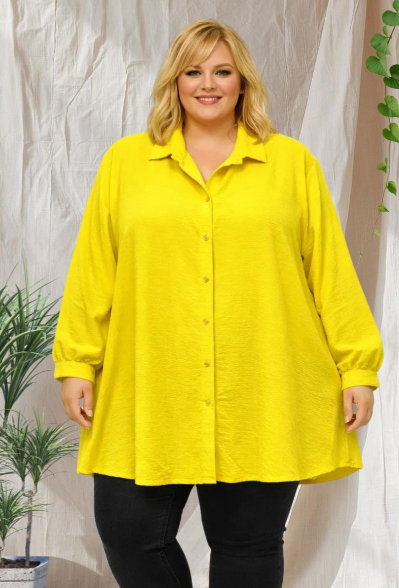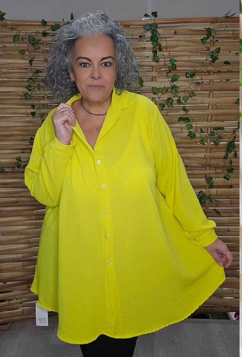 Camisa larga, vaporosa y extragrande, confeccionada en crepé de viscosa suave y ligeramente elástico. Corte evasé con abertura en la espalda, muy cómoda y favorecedora para tallas grandes.